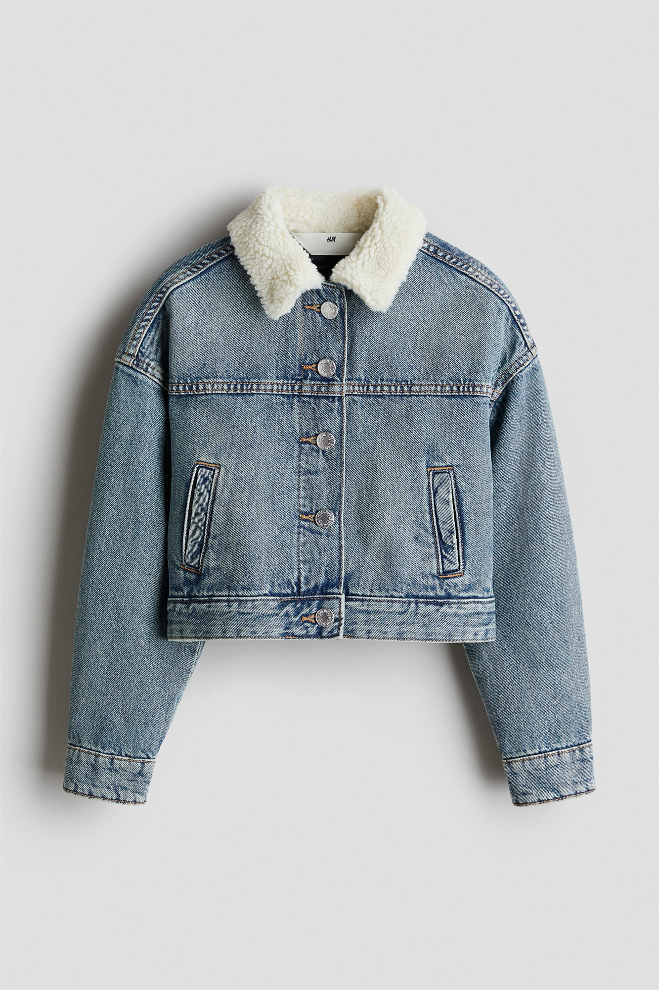 Короткая куртка из хлопкового денима с мягким плюшевым воротником. Свободный крой, застежка на пуговицах спереди, втачные боковые карманы, спущенные плечи, ярмо и манжеты на пуговицах. Стеганая подкладка.
