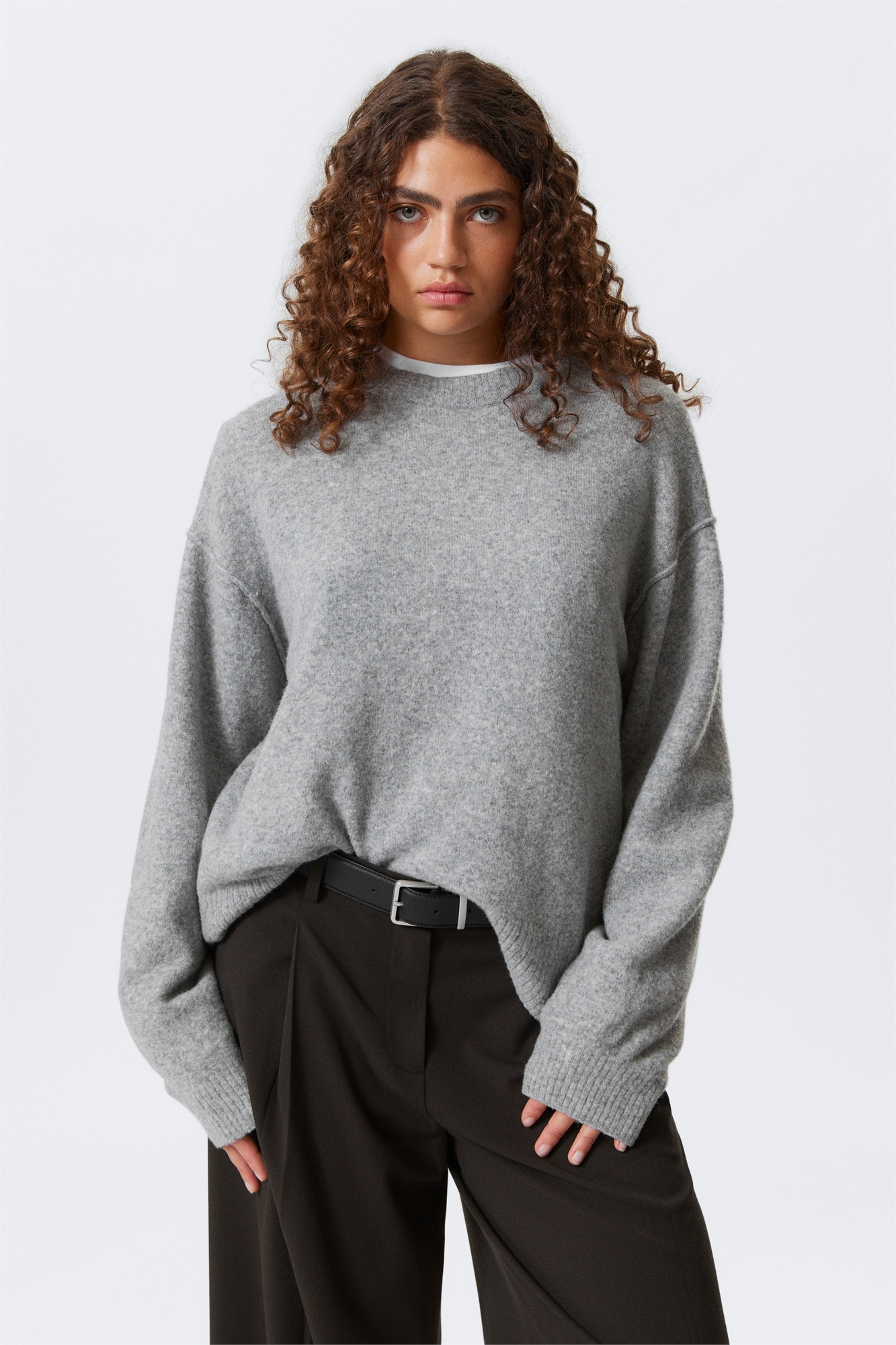 Вязаный свитер свободного кроя из мягкой смеси переработанного полиамида и переработанного полиэстера с добавлением переработанного эластана и шерсти для дополнительной растяжимости и тепла. Круглый ребристый вырез, спущенные плечи и ребристые края.