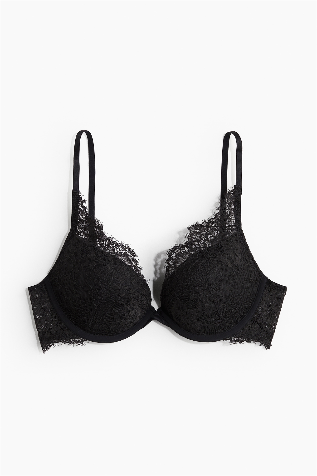 Кружевной бюстгальтер-пуш-ап с регулируемыми бретелями и чашечками с плотной подкладкой, которые максимально увеличивают объем бюста и создают более глубокое декольте. Застежка на крючки и глазки сзади.