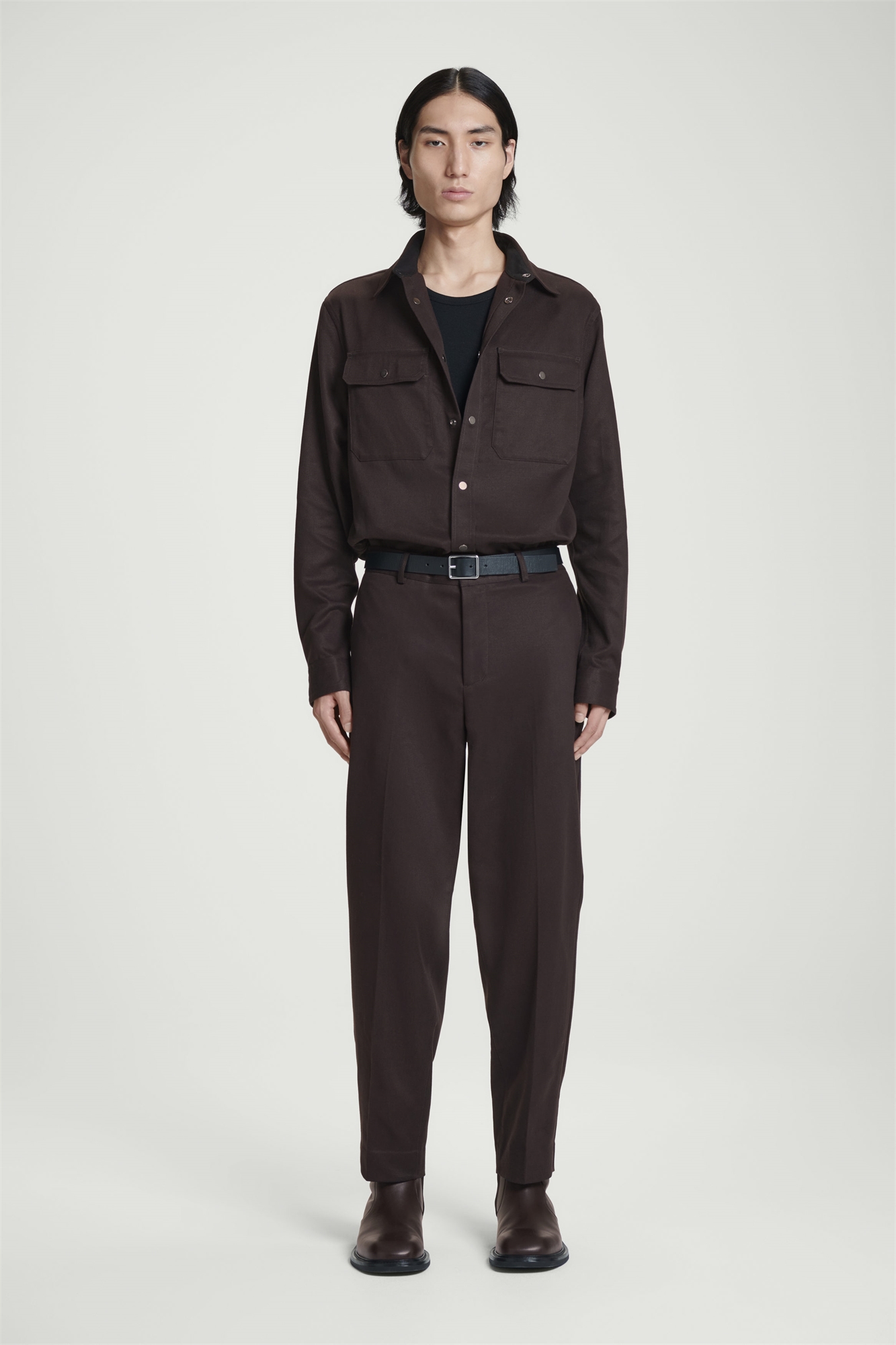 Эти зауженные брюки, созданные в духе рабочей одежды, позволяют преодолеть разрыв между элегантным и повседневным стилем. Они изготовлены из смеси TENCEL™ Lyocell и хлопка и окантованы прочной строчкой из мерсеризованного хлопка для долговечности. Носите их с подходящей рубашкой. Регулярный крой, длина по щиколотку Застежка на крючок и молнию TENCEL™ является торговой маркой Lenzing AG. TENCEL™ Lyocell производится из возобновляемых древесных источников с использованием процесса, в котором перерабатывается 99% всех химикатов и воды Оболочка: 55% TENCEL™ Lyocell, 45% хлопок. Подкладка карманов: 100% хлопок. Без учета отделки / Машинная стирка Внутренняя длина ноги размера EU 48 составляет 73,9 см / Модель носит размер EU 48
