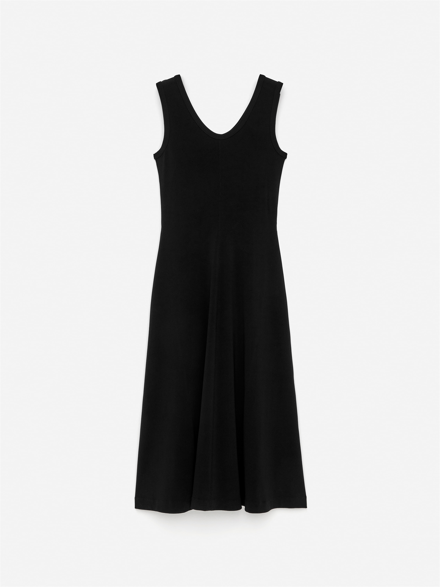 Платье длиной до щиколотки с тонким глянцевым блеском, созданное из трикотажного джерси в рубчик с намеком на стрейч. Облегающий фасон с широкими бретелями и глубоким U-образным вырезом спереди и сзади. Спереди и сзади по центру разрезная строчка.