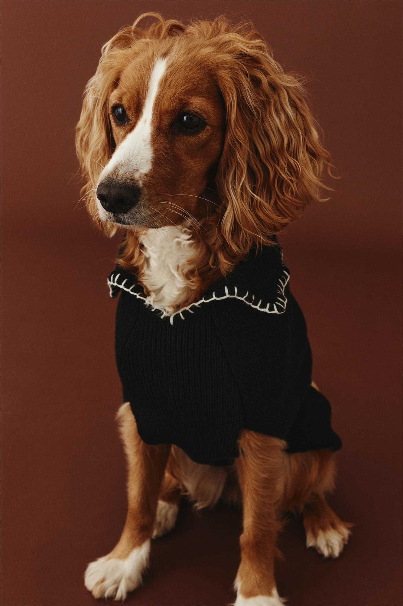 Джемпер для собак из мягкого ребристого трикотажа с контрастными швами-петлями на воротнике. Отверстия для передних лапок и более широкие ребристые манжеты сзади.