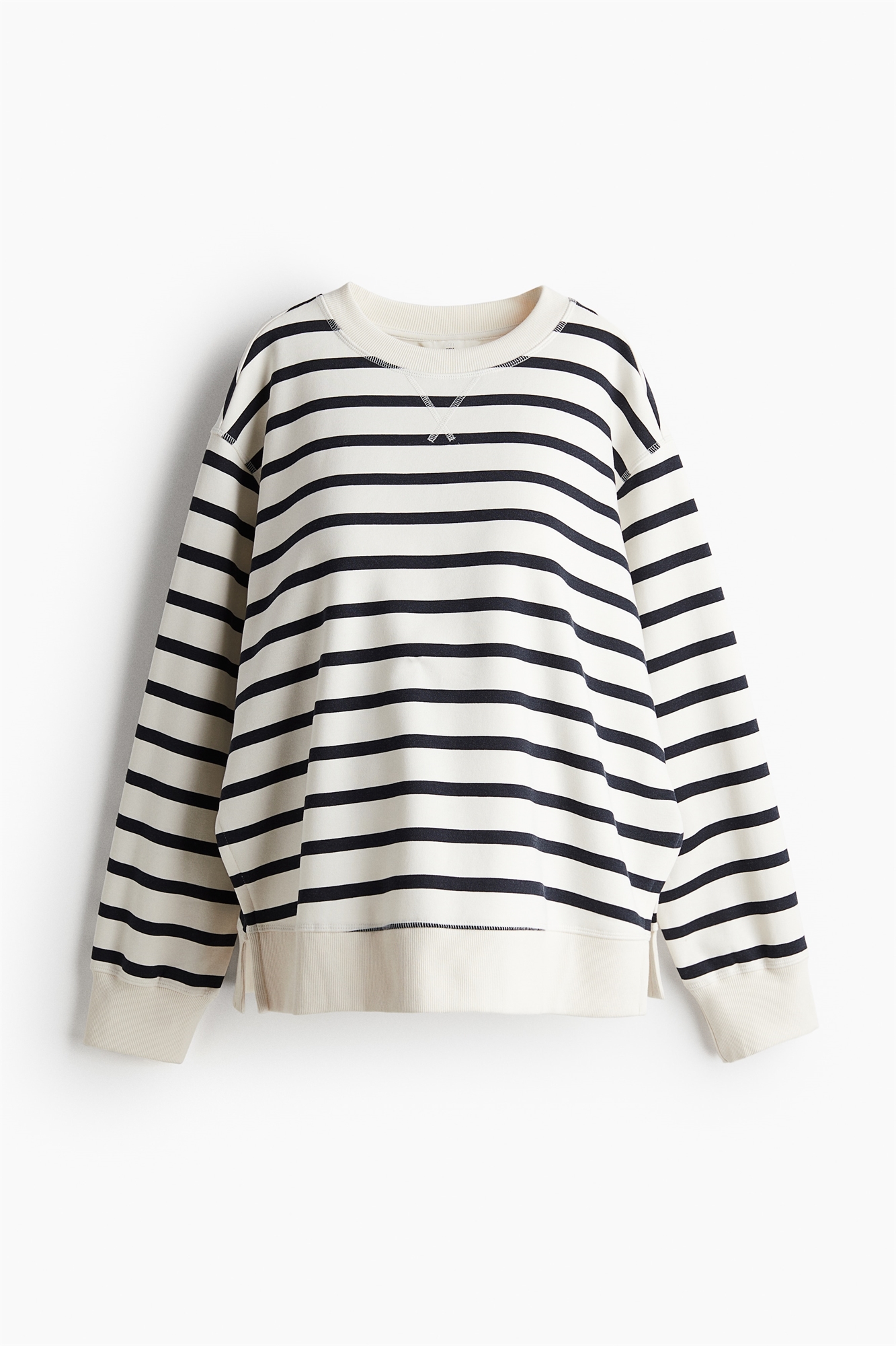 Топ из хлопкового бленда с мягкой ворсистой изнанкой. Спущенные плечи, длинные рукава и разрез с каждой стороны подола. Окантовка по вырезу горловины, манжетам и подолу.