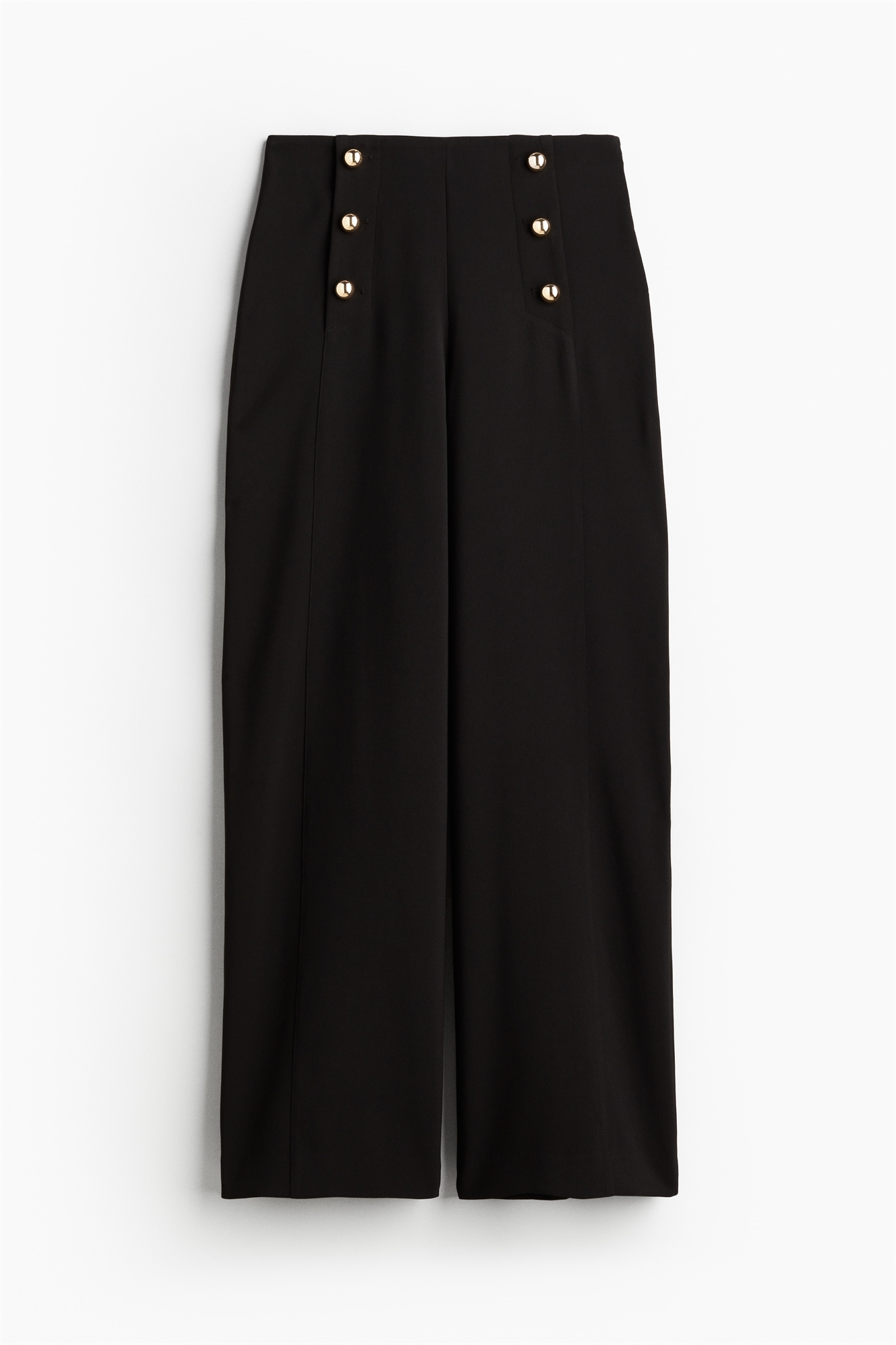 Брюки из саржи с высокой талией, декоративными пуговицами золотистого цвета спереди и потайной застежкой-молнией с одной стороны. Накладные задние карманы и широкие ноги с видимыми швами спереди.