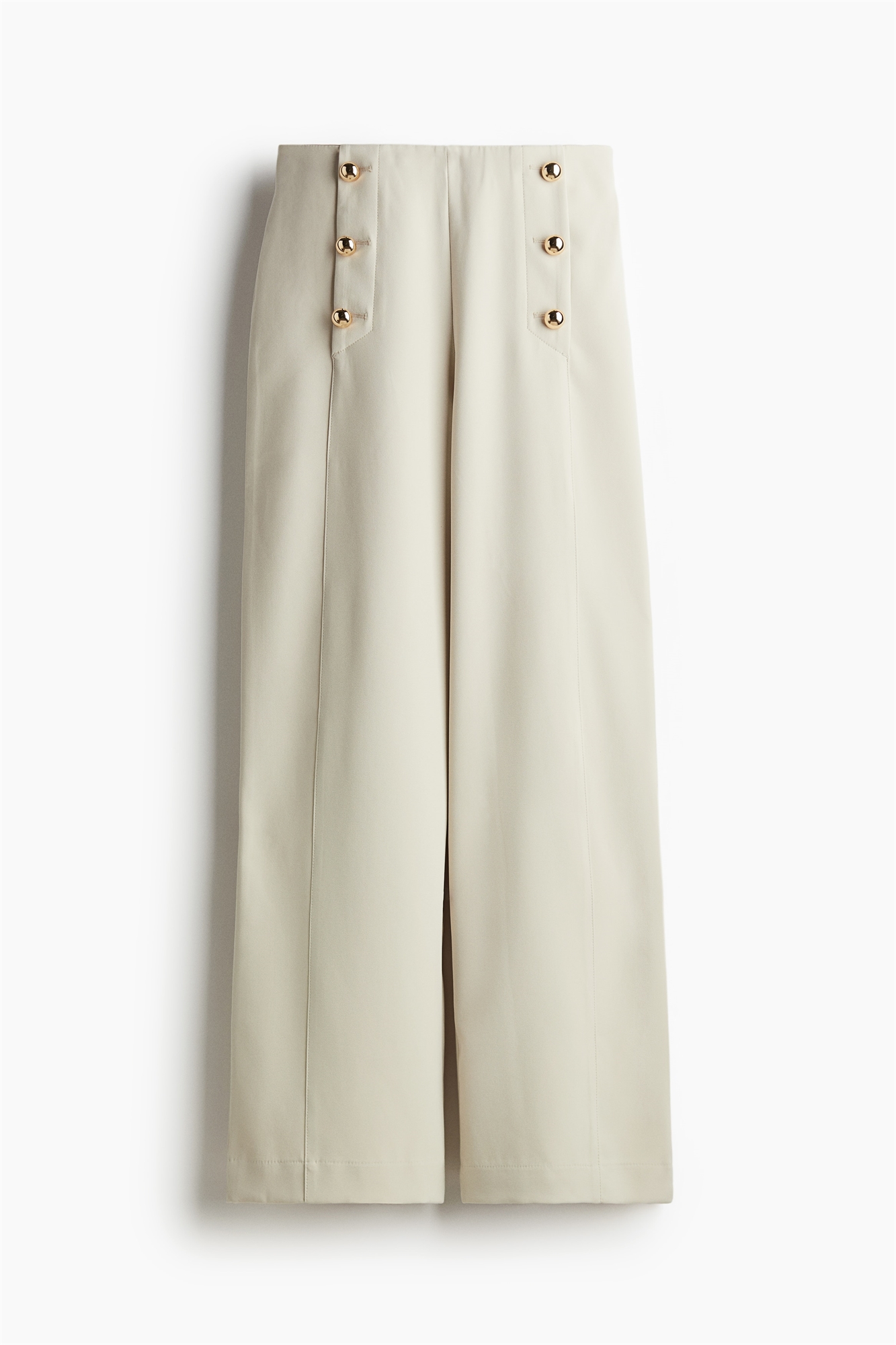 Брюки из саржи с высокой талией, декоративными пуговицами золотистого цвета спереди и потайной застежкой-молнией с одной стороны. Накладные задние карманы и широкие ноги с видимыми швами спереди.