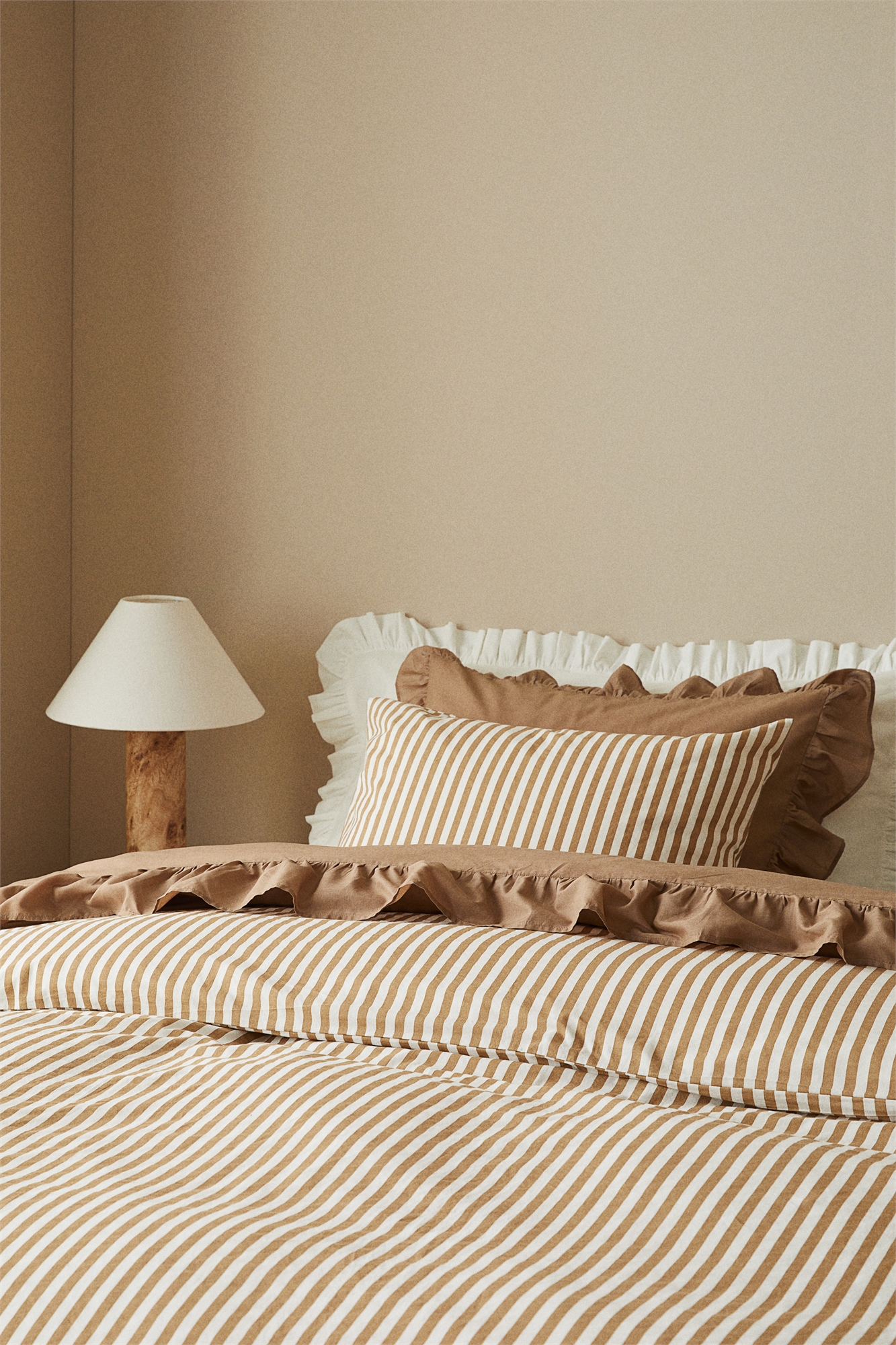 Односпальный комплект постельного белья в полоску из хлопкового полотна с количеством нитей 144, выстиранного для придания ему особой мягкости. Одна наволочка с отверстием для конверта.