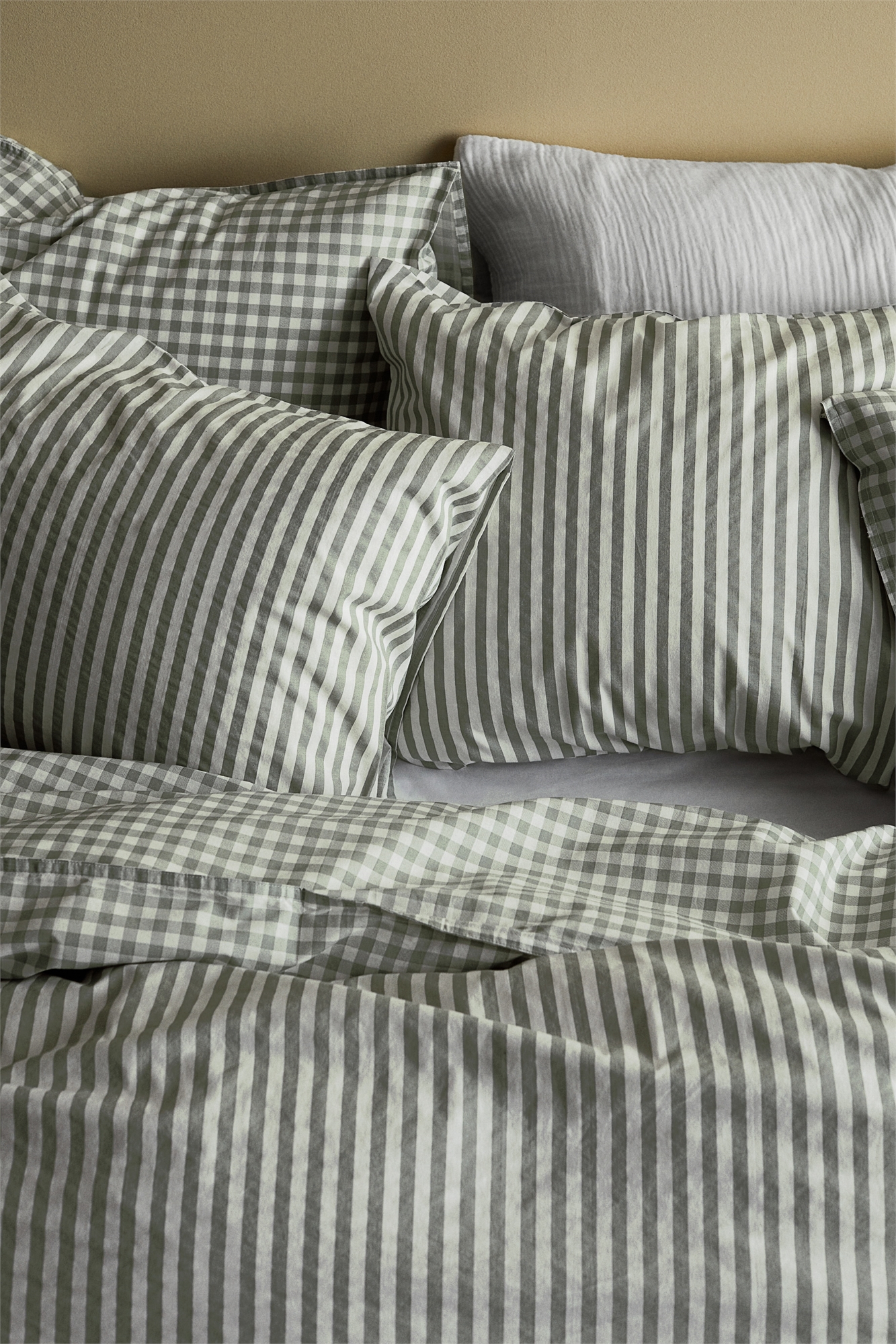 Комплект постельного белья в полоску, для двуспальной кровати и кровати king size из хлопка с количеством нитей 144, стиранного для придания ему особой мягкости. Две наволочки с отверстием конверт.