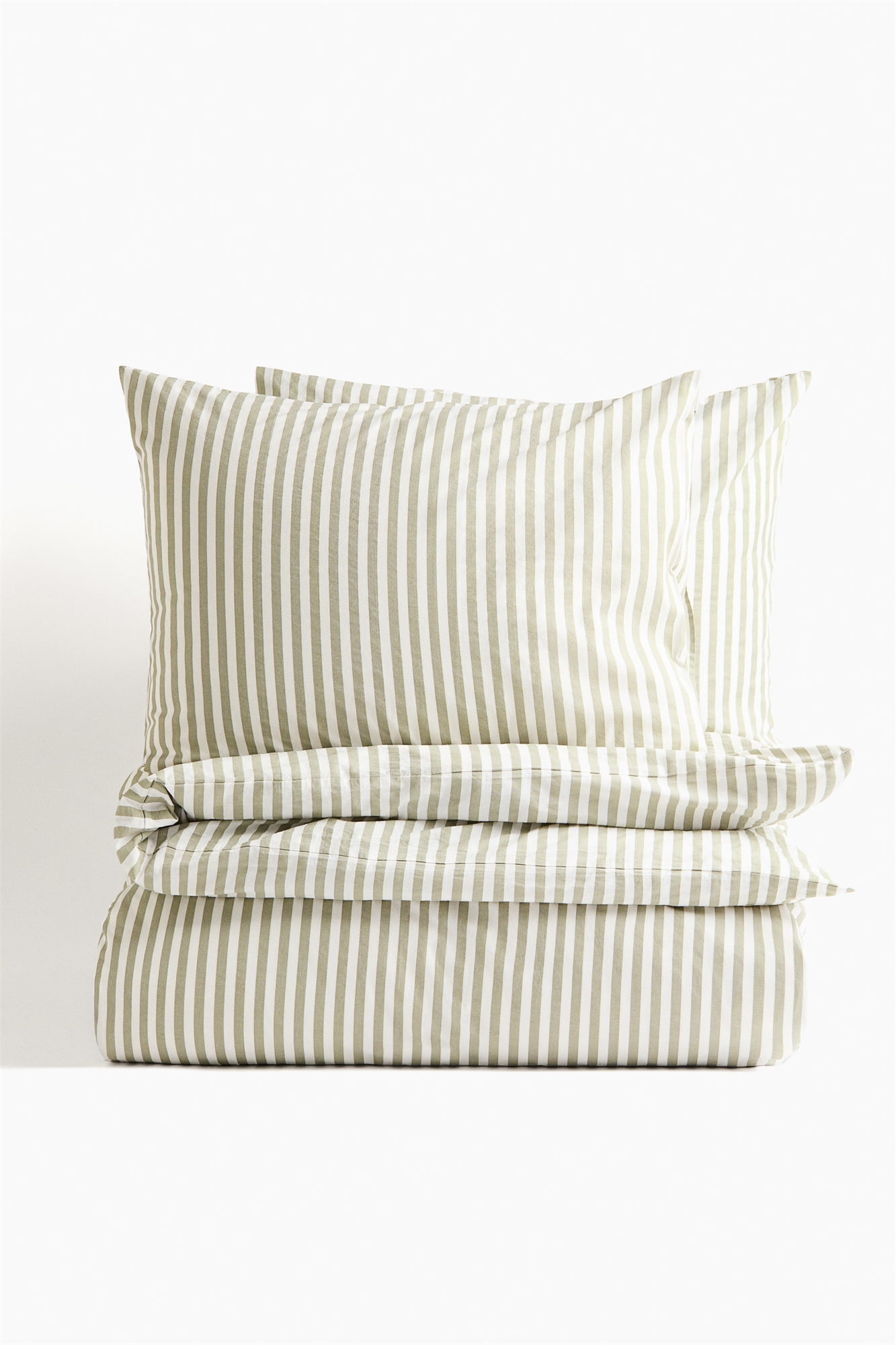 Комплект постельного белья в полоску, для двуспальной кровати и кровати king size из хлопка с количеством нитей 144, стиранного для придания ему особой мягкости. Две наволочки с отверстием конверт.