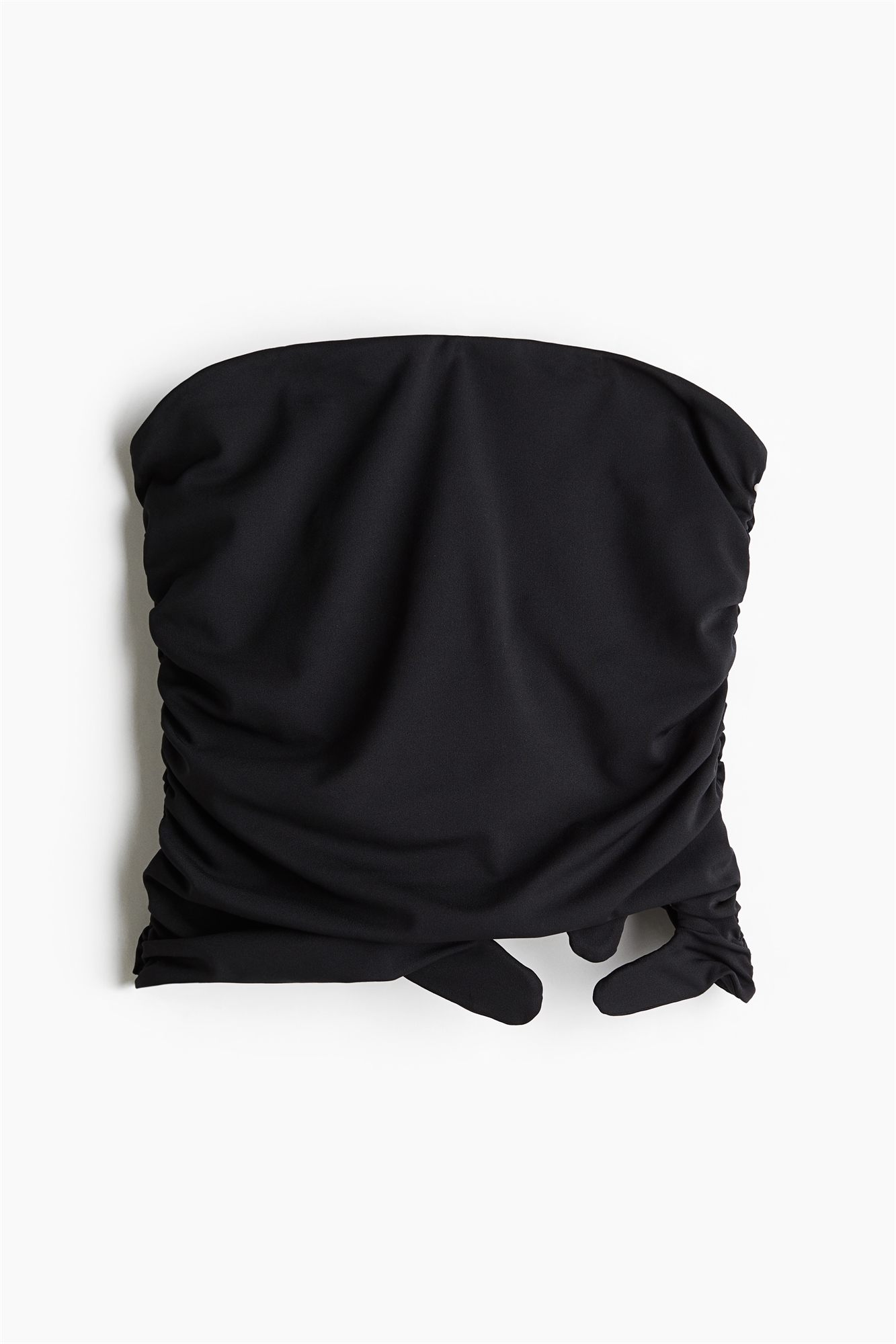 Короткий приталенный топ-бандо из эластичного джерси с асимметричным вырезом и бонами по подолу. Боковые швы с рюшами. Потайная пуговица и видимая застежка-молния с характерной формой сзади. На подкладке.
