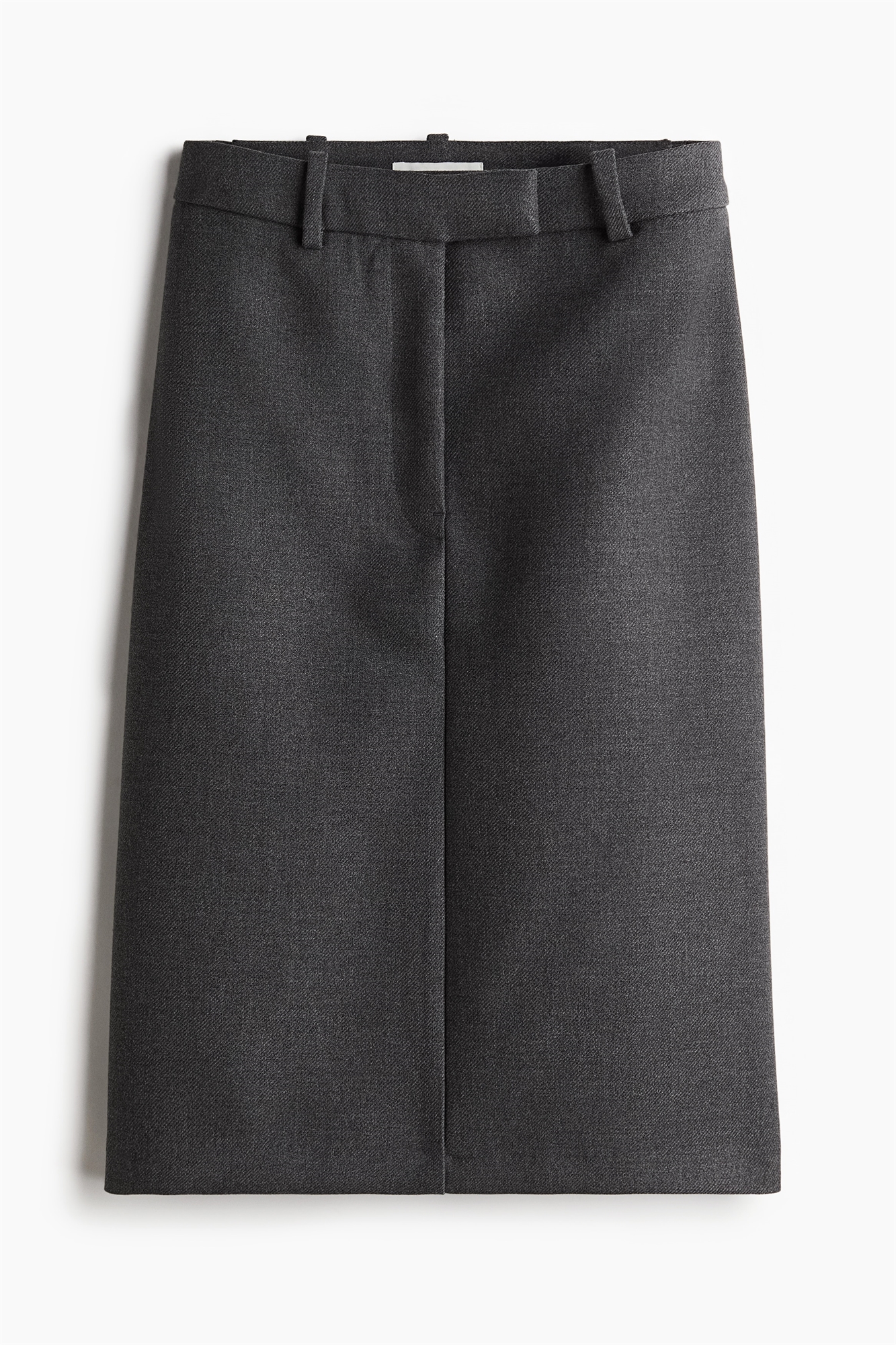 Юбка длиной до колена с высокой талией и удлиненным поясом с потайными застежками-крючками. Притачной карман сзади и разрез сзади на подоле. Без подкладки.