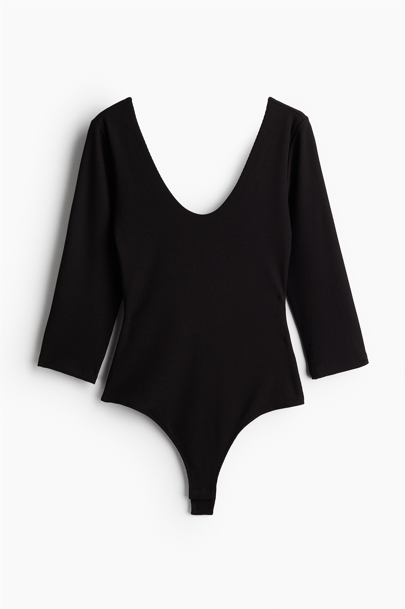 Боди-стринги из ребристого джерси с вырезом-лодочкой спереди и сзади, рукавами длиной 3/4 и потайными кнопками в области промежности. Частично на подкладке.