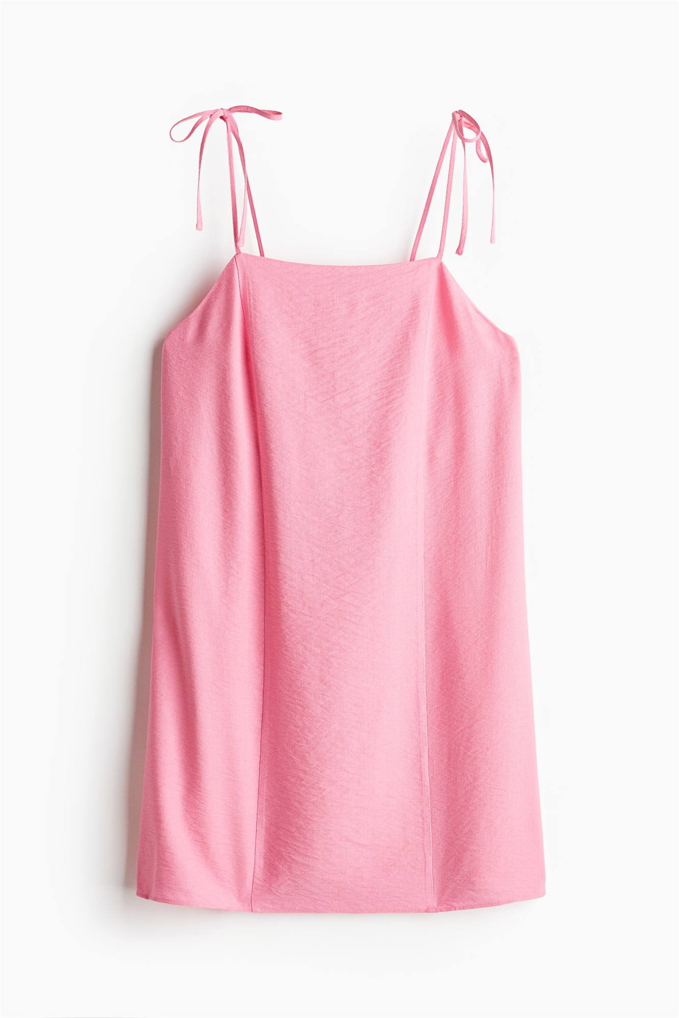 Короткое платье из тканого материала с квадратным вырезом, завязывающимися бретелями-спагетти и потайной застежкой на молнию и крючок с глазом с одной стороны. Видимые швы спереди и сзади и прямой подол. Подкладка из хлопкового вуаля.