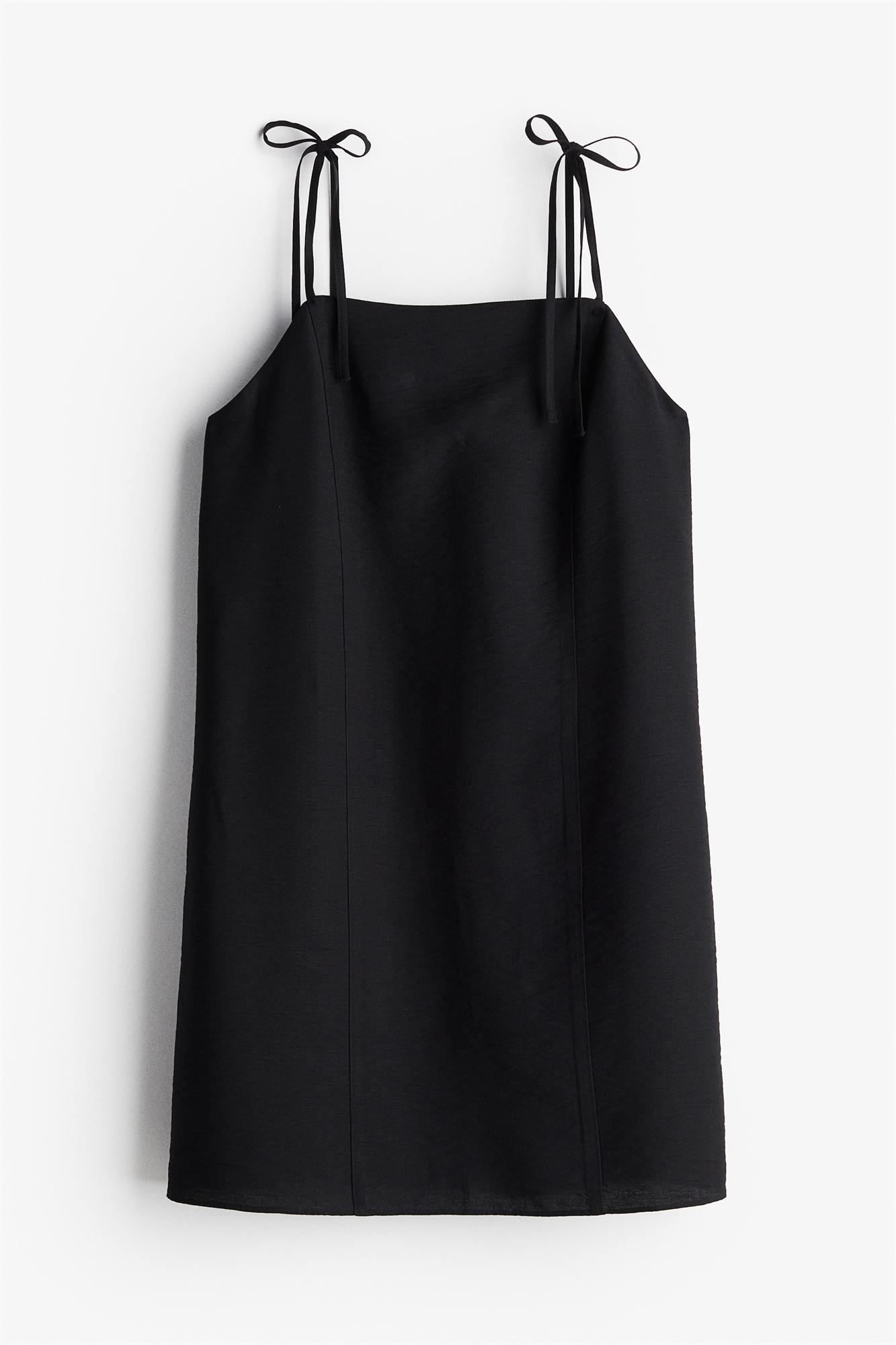 Короткое платье из тканого материала с квадратным вырезом, завязывающимися бретелями-спагетти и потайной застежкой на молнию и крючок с глазом с одной стороны. Видимые швы спереди и сзади и прямой подол. Подкладка из хлопкового вуаля.