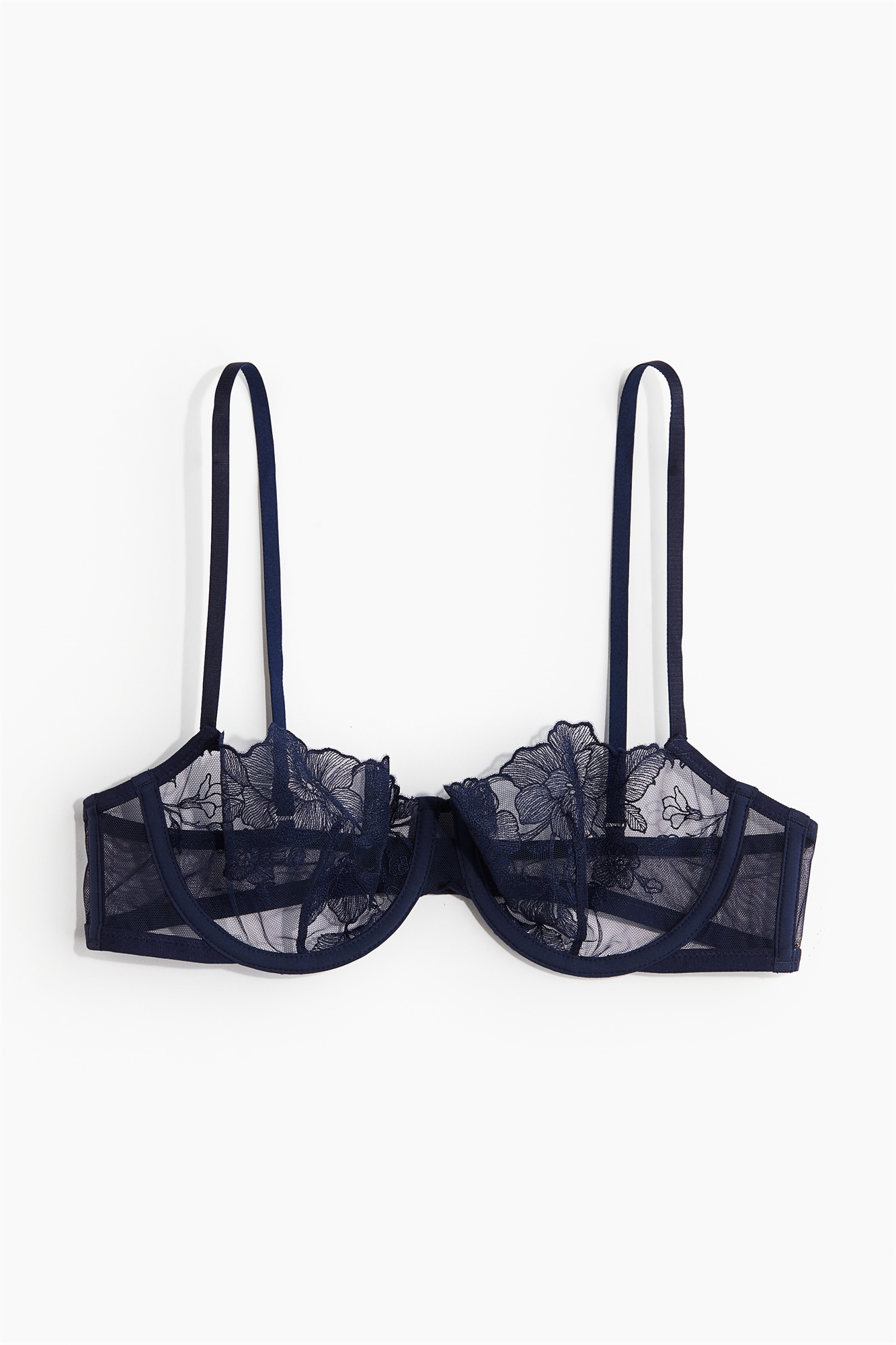 Бюстгальтер-балконет из прозрачной сетки с нежной вышивкой. Чашечки без подкладки с заниженной талией придают бюсту естественную форму и обеспечивают легкую поддержку. Боковая поддержка, регулируемые бретели и застежка на крючки и глазки сзади.