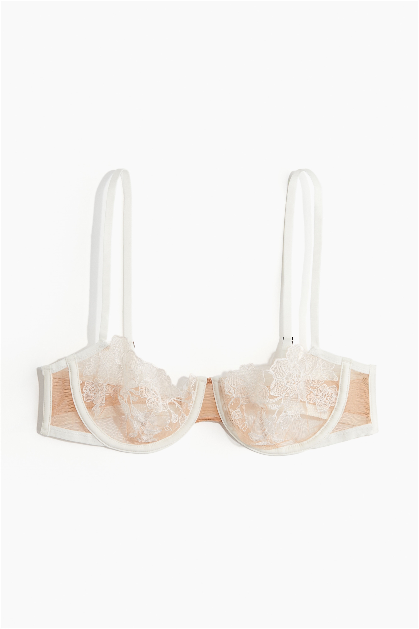 Бюстгальтер-балконет из прозрачной сетки с нежной вышивкой. Чашечки без подкладки с заниженной талией придают бюсту естественную форму и обеспечивают легкую поддержку. Боковая поддержка, регулируемые бретели и застежка на крючки и глазки сзади.