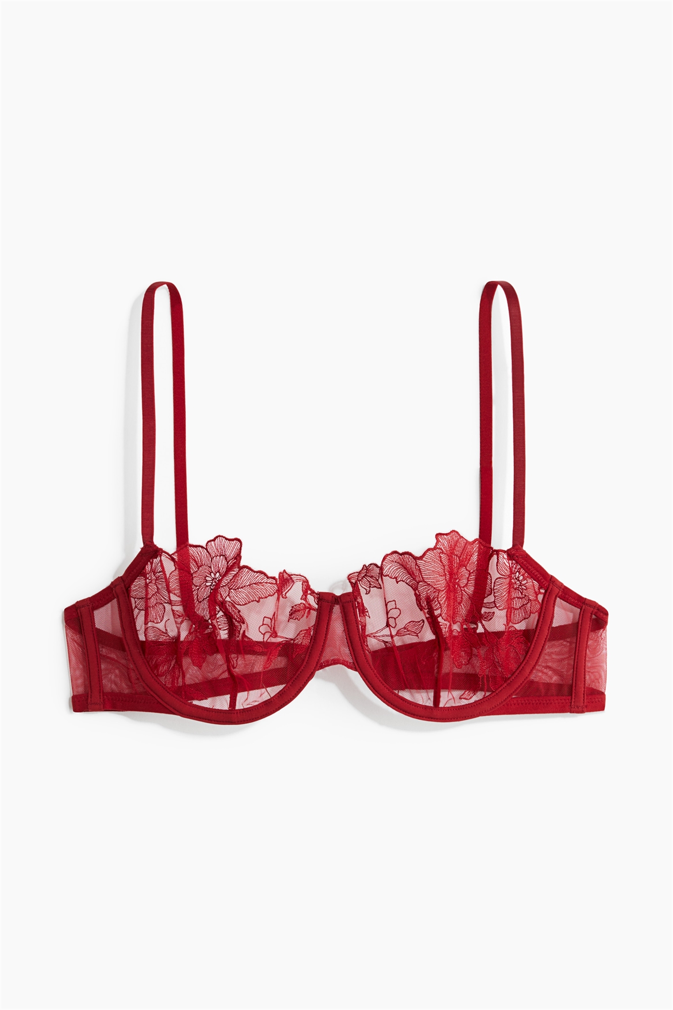 Бюстгальтер-балконет из прозрачной сетки с нежной вышивкой. Чашечки без подкладки с заниженной талией придают бюсту естественную форму и обеспечивают легкую поддержку. Боковая поддержка, регулируемые бретели и застежка на крючки и глазки сзади.
