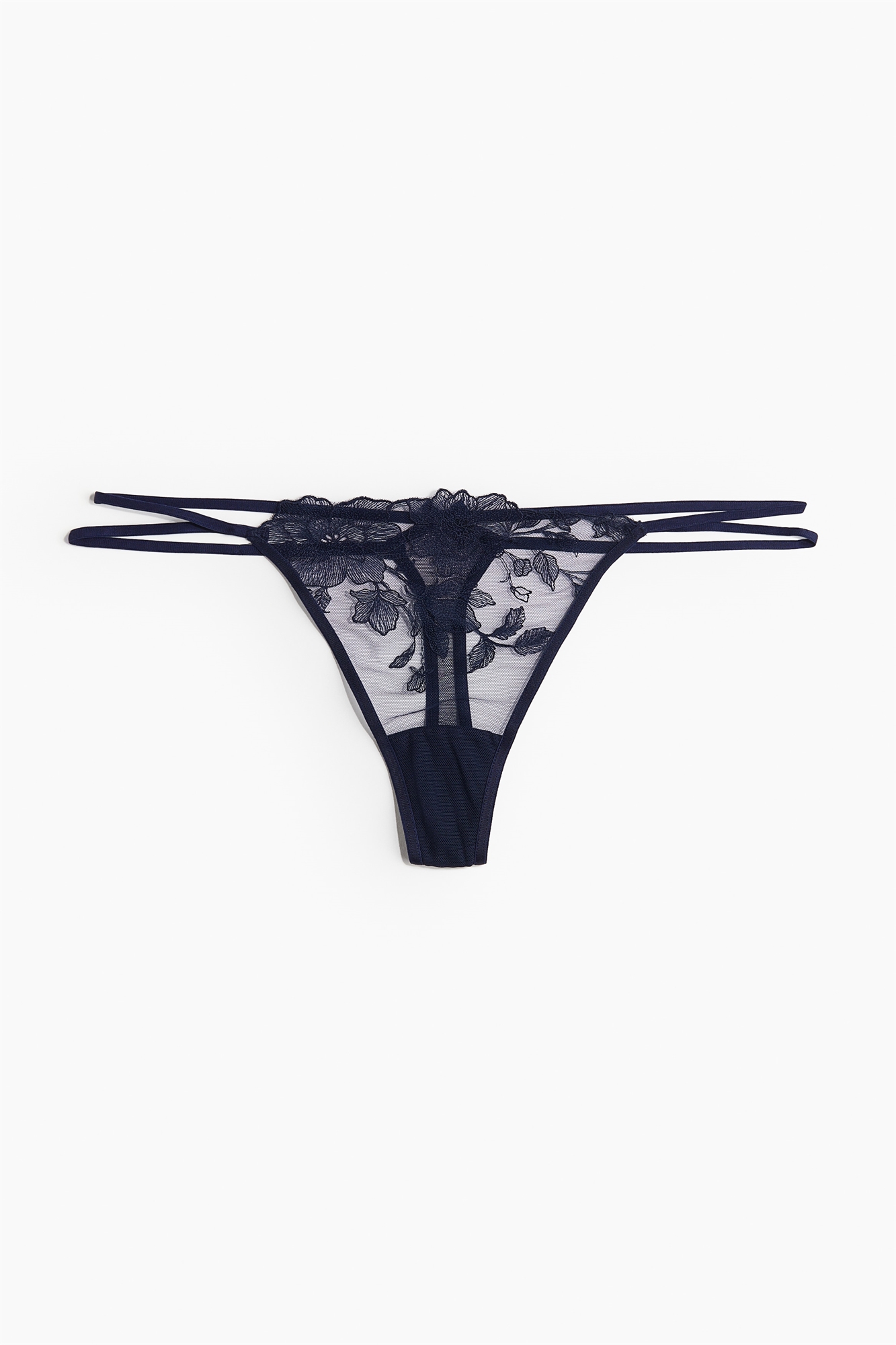 Трусы-стринги из прозрачной сетки с нежной вышивкой. Заниженная талия, узкие, двойные бока и ластовица на подкладке.