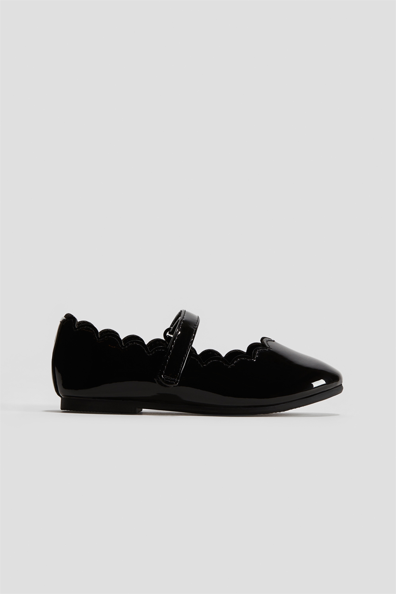 Балетки с лакированной отделкой и гребешковым краем вокруг проймы. Регулируемый язычок с крючком и петлей на ноге и петля из гросгрейн сзади. Атласные подкладка и стелька.