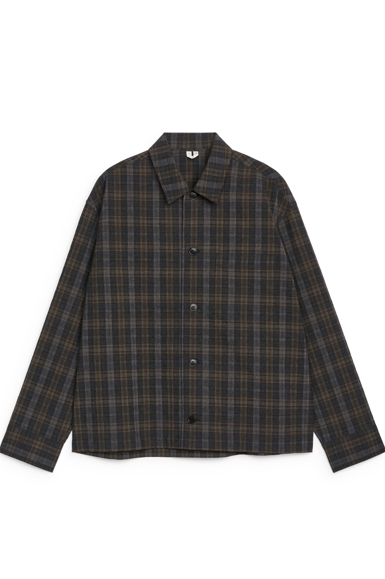 Клетчатый жакет из шерстяной смеси. Свободный крой со слегка спущенными плечами. Воротник, застежка на пуговицы и накладной карман на груди. Сзади накладной карман. Манжеты на пуговицах.