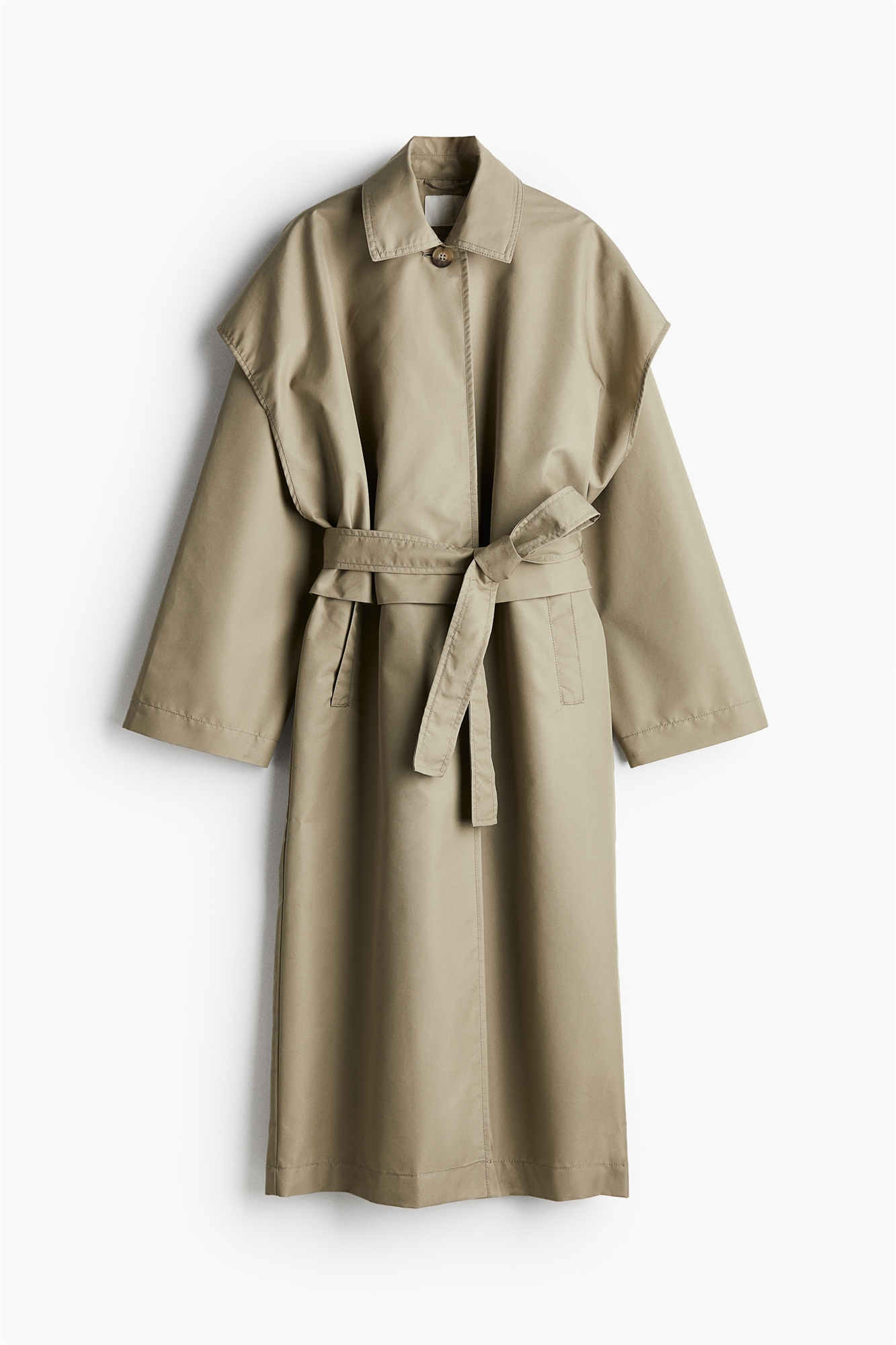 Свободный тренч макси из саржи с двойным слоем в верхней части. Воротник, потайные пуговицы спереди, прорезные боковые карманы и широкий съемный пояс-завязка на талии. Одиночная вентиляция на спине. Без подкладки.