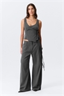 Костюмные брюки с низкой талией изготовлены из переработанного полиэстера, дополненного вискозой и эластаном для дополнительной растяжимости и комфорта. Застежка-молния с застежкой на крючок и глазок, косые боковые карманы, втачные задние карманы, широкие просторные ноги, складки спереди и задние вытачки для придания дополнительной структуры.