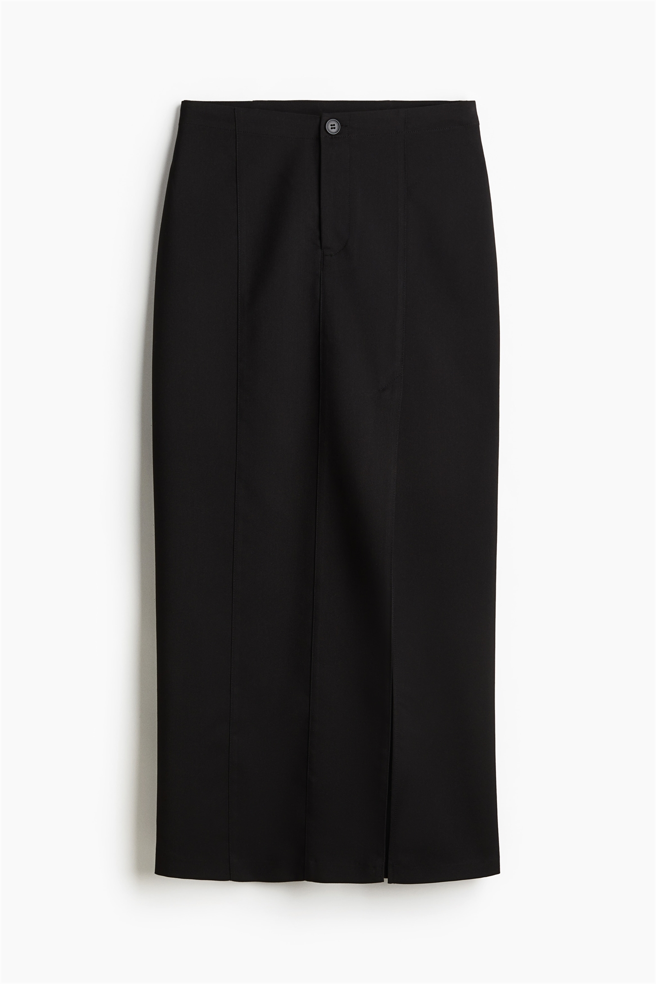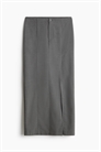 Приталенная юбка длиной до щиколоток из саржи с ширинкой на молнии и пуговице, застроченными складками спереди, втачными карманами сзади и прямым подолом с высоким разрезом с одной стороны спереди. Без подкладки.