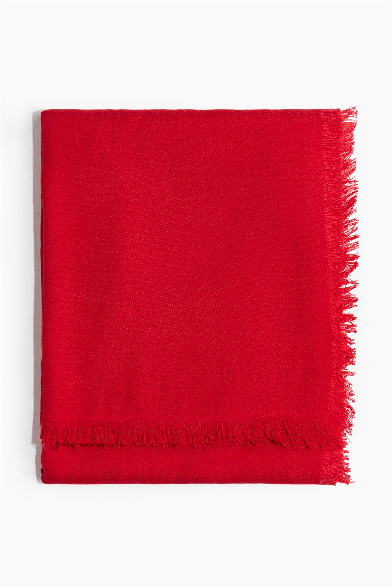 Большой уютный шарф мягкого плетения с легкой матовой поверхностью и обтрепанными краями.