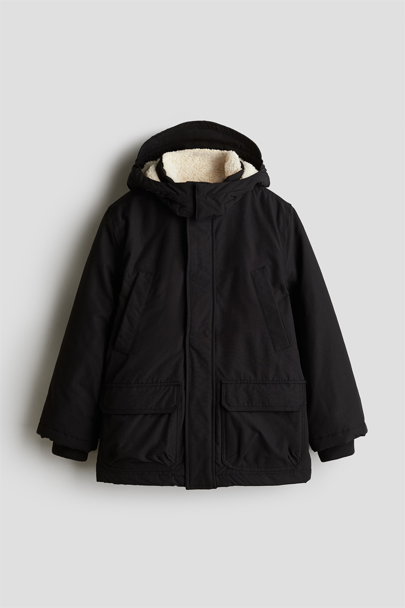 Плюшевая парка с мягкой подкладкой и съемным капюшоном. Воротник-стойка, застежка-молния спереди и ветрозащитная планка с потайными кнопками. Карманы для грелок и передние карманы с клапанами с потайными кнопками.