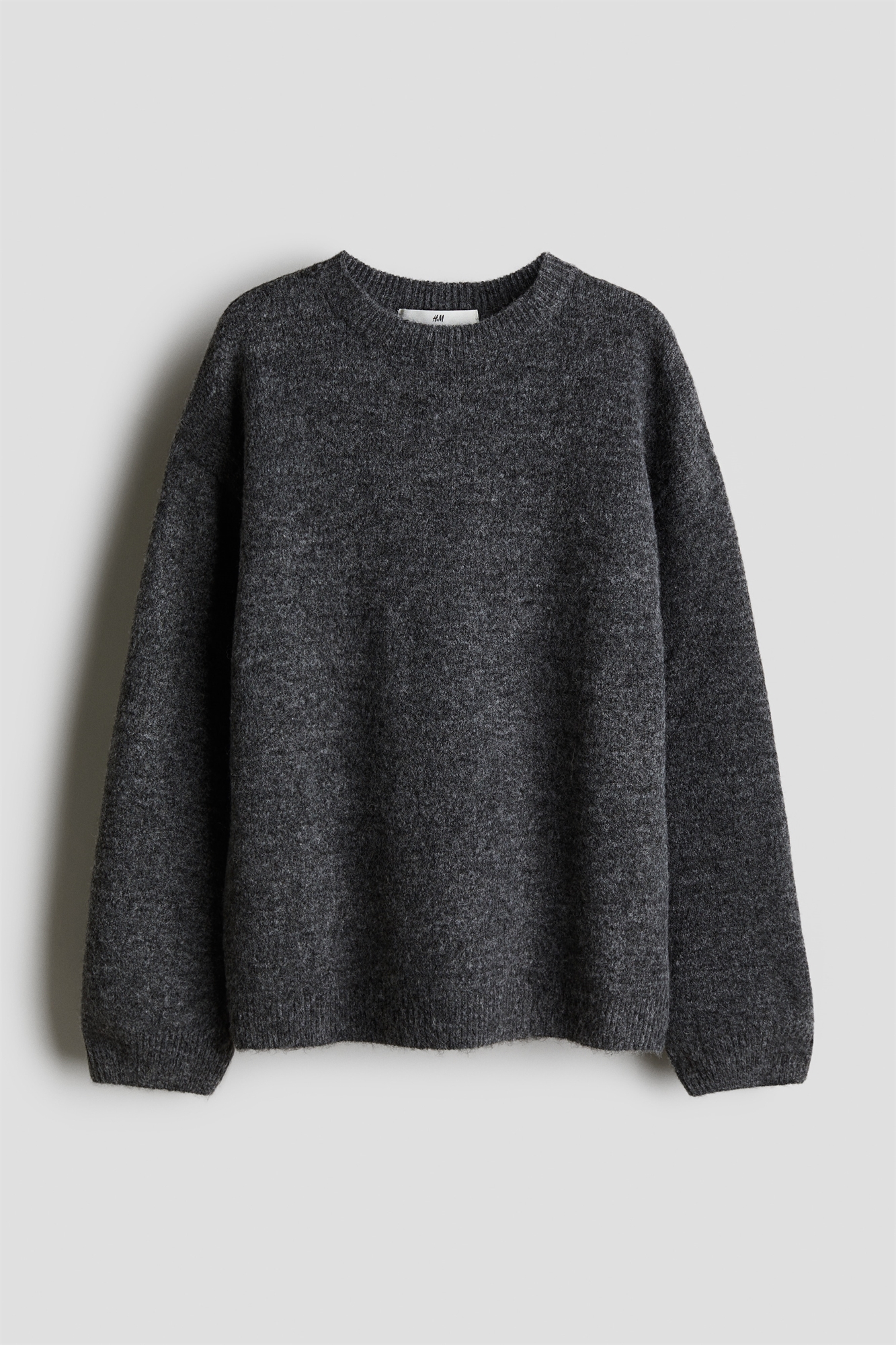Джемпер свободного кроя из мягкого трикотажа с круглым вырезом в рубчик, спущенными плечами и длинными рукавами. Ребристые манжеты и подол.