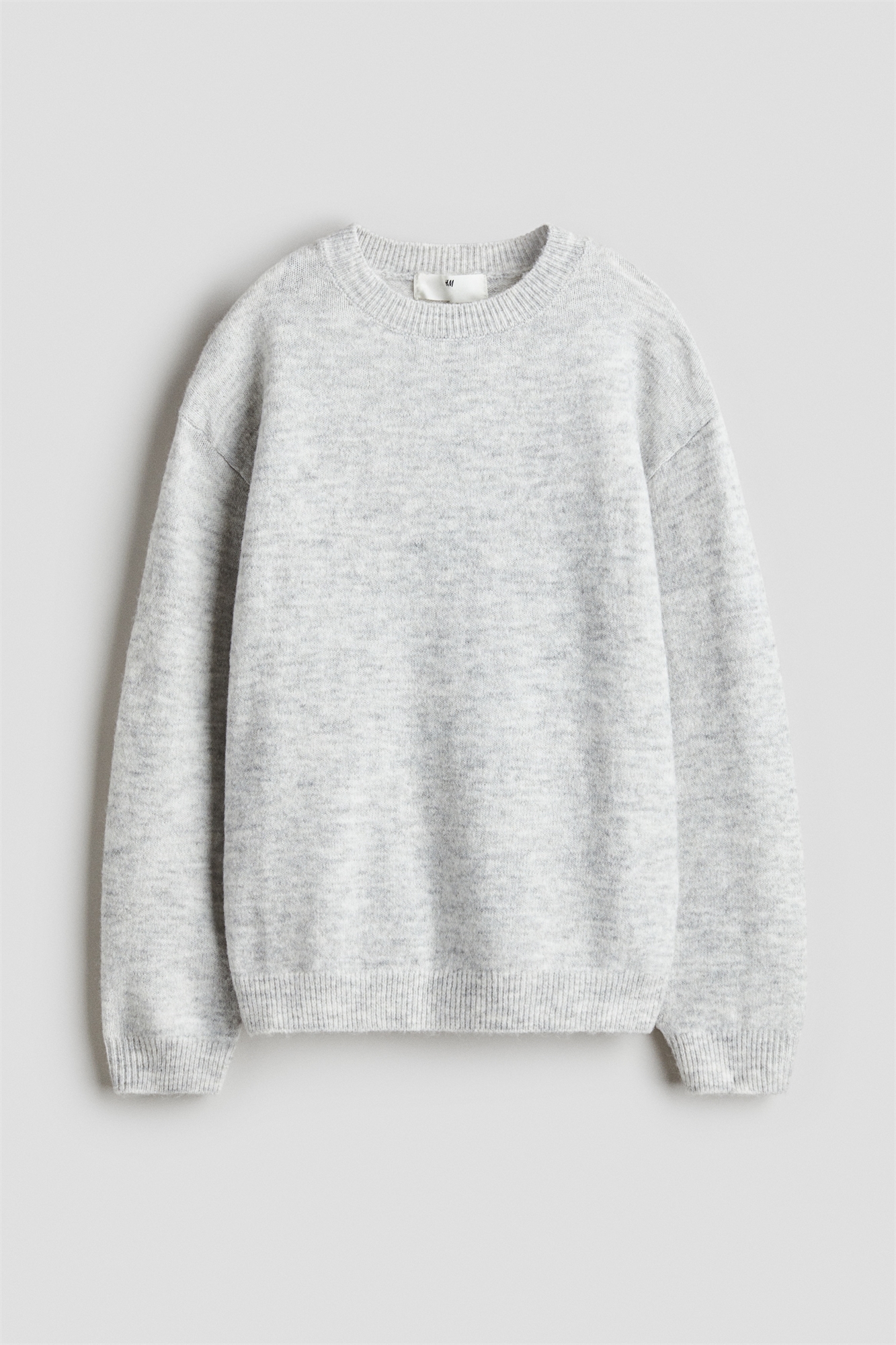 Джемпер свободного кроя из мягкого трикотажа с круглым вырезом в рубчик, спущенными плечами и длинными рукавами. Ребристые манжеты и подол.