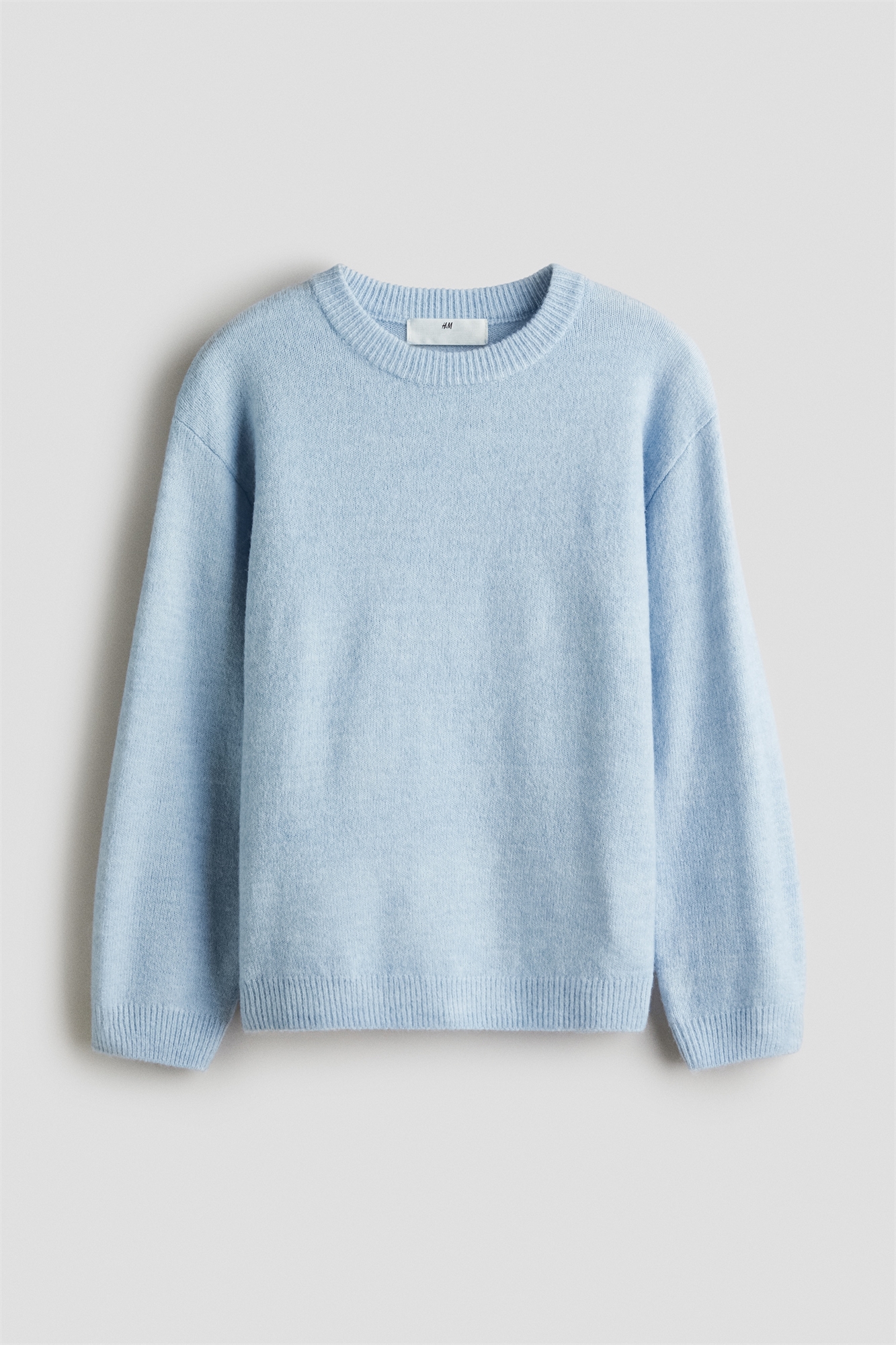 Джемпер свободного кроя из мягкого трикотажа с круглым вырезом в рубчик, спущенными плечами и длинными рукавами. Ребристые манжеты и подол.