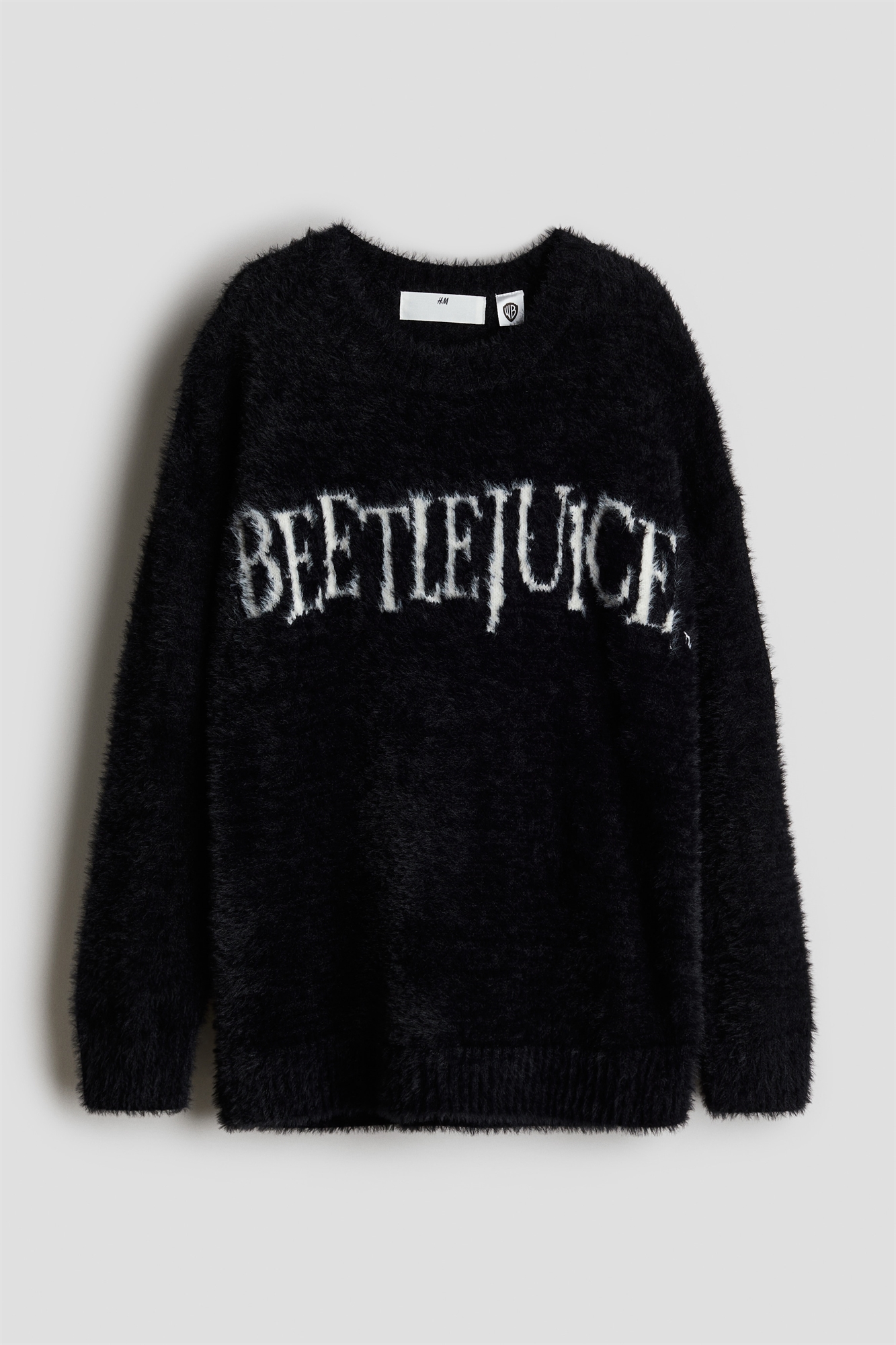 Джемпер свободного покроя из пушистого жаккарда с круглым вырезом, спущенными плечами, манжетами и подолом в рубчик.