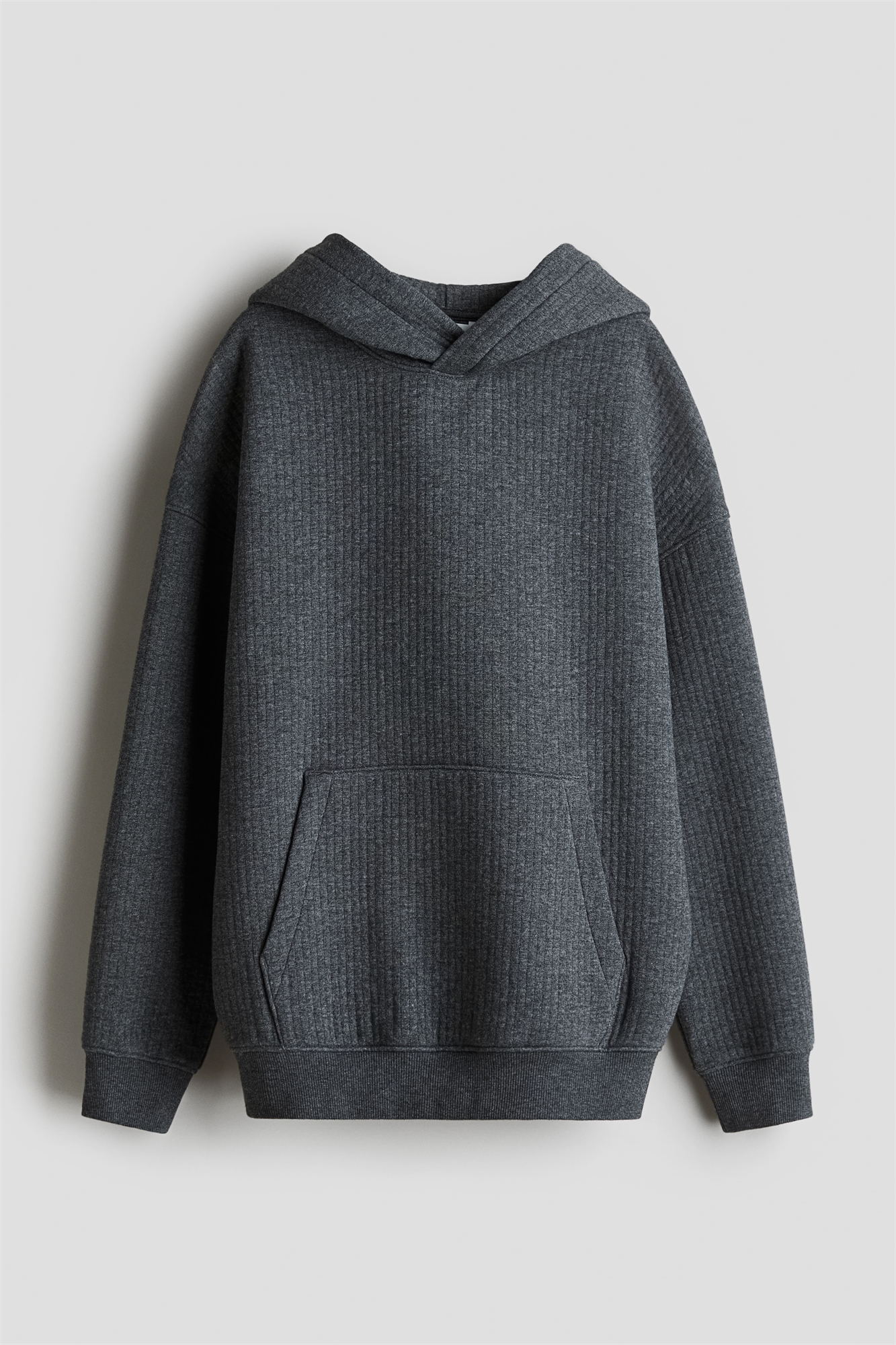 Свободный топ из ребристой толстовки с капюшоном на подкладке. Спущенные плечи, длинные рукава и карман-кенгуру. Ребристые манжеты и подол.