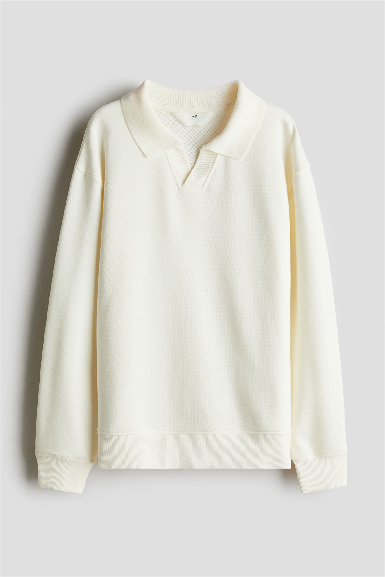 Рубашка-поло из легкой толстовочной ткани с ребристым воротником и V-образной проймой спереди. Спущенные плечи, длинные рукава, манжеты и подол в рубчик.