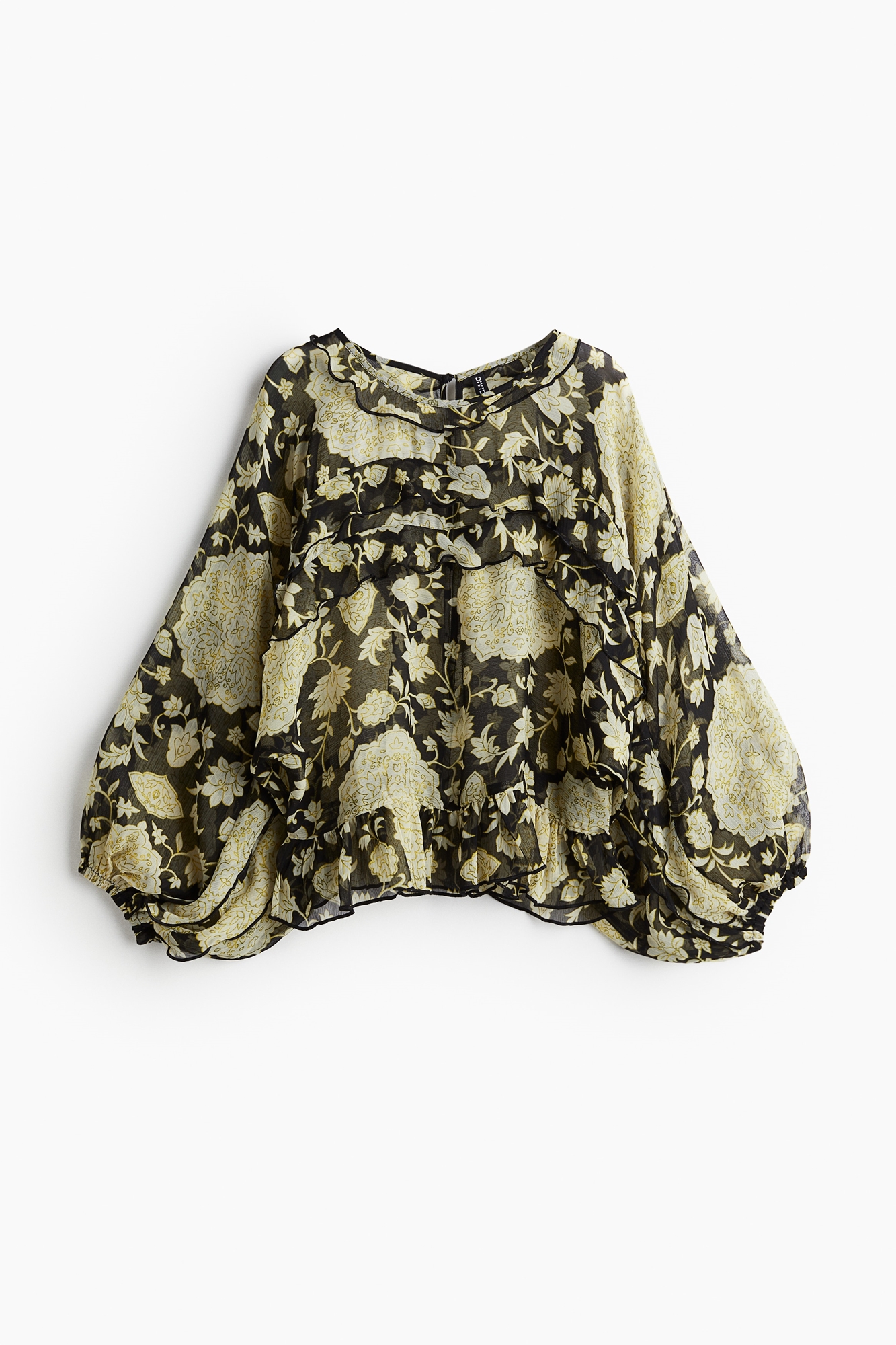 Свободная блузка из гладкого шифона с круглым вырезом, застежкой на пуговицы сзади и длинными объемными рукавами-баллонами с узкими эластичными манжетами. Отделка воланами из оверлока по вырезу горловины и на груди, а также отделка на груди, переходящая в рукава. Видимый шов и оверлочная отделка оборкой над подолом.
