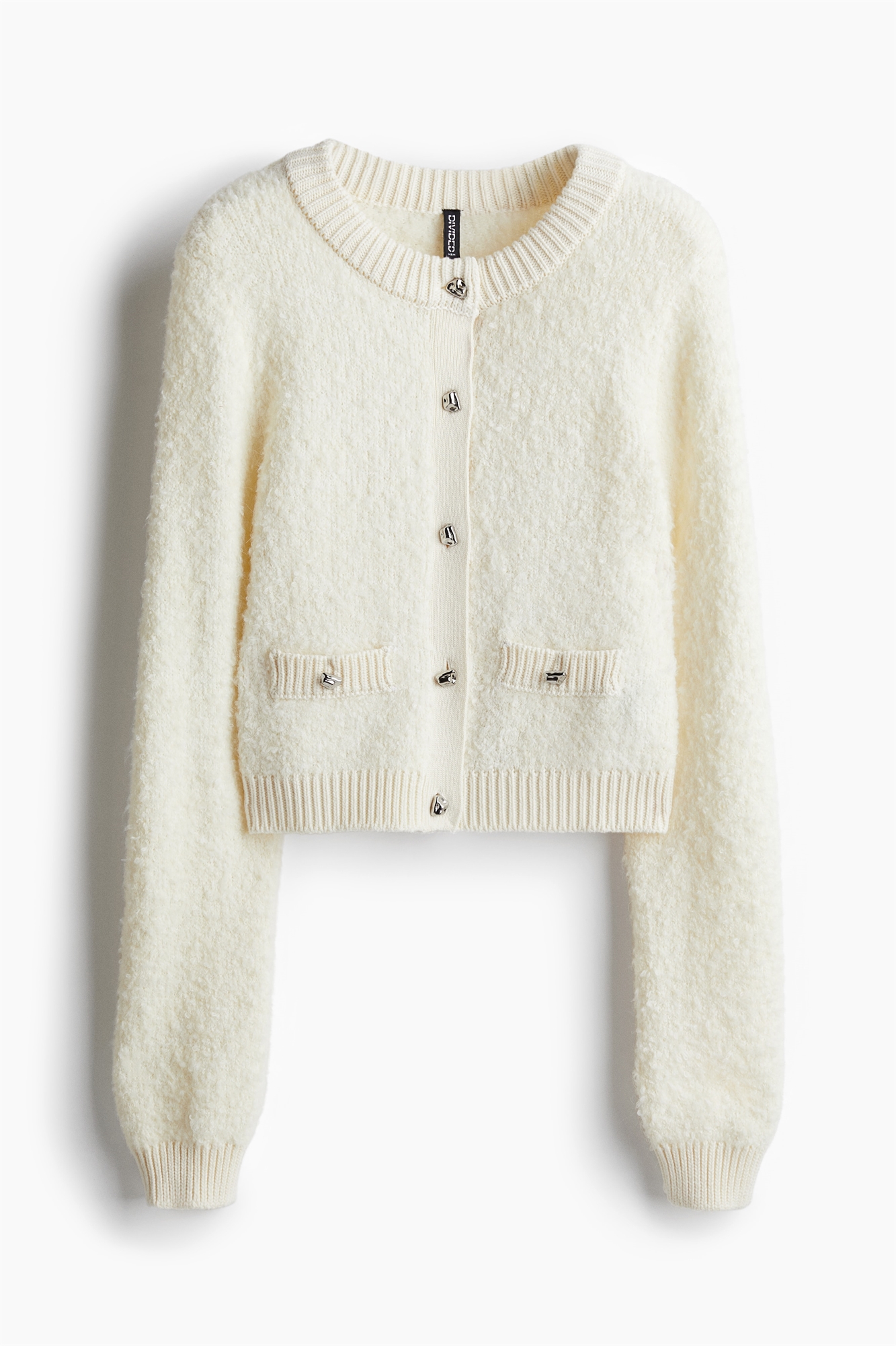 Короткий кардиган из мягкого трикотажа букле с круглым вырезом с ребристой отделкой и металлическими пуговицами спереди. Длинные рукава и декоративные передние карманы с ребристыми швами и металлической пуговицей. Ребристые манжеты и подол.
