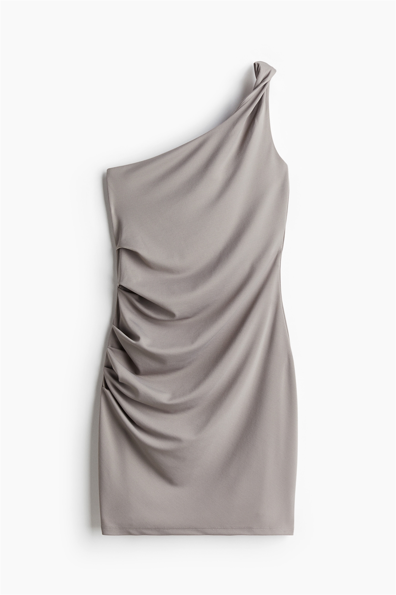 Короткое, приталенное платье на одно плечо из мягкого джерси с легким блеском. Асимметричный вырез, одна перекрученная бретель и складки с одной стороны для создания эффекта драпировки.