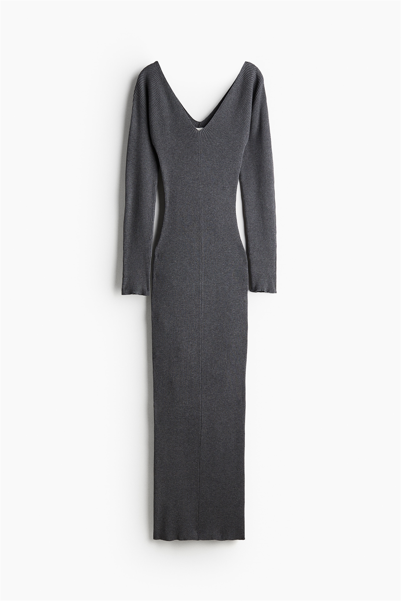 Приталенное платье длиной до колен из плотного трикотажа в рубчик с длинными рукавами и широким V-образным вырезом спереди и сзади.