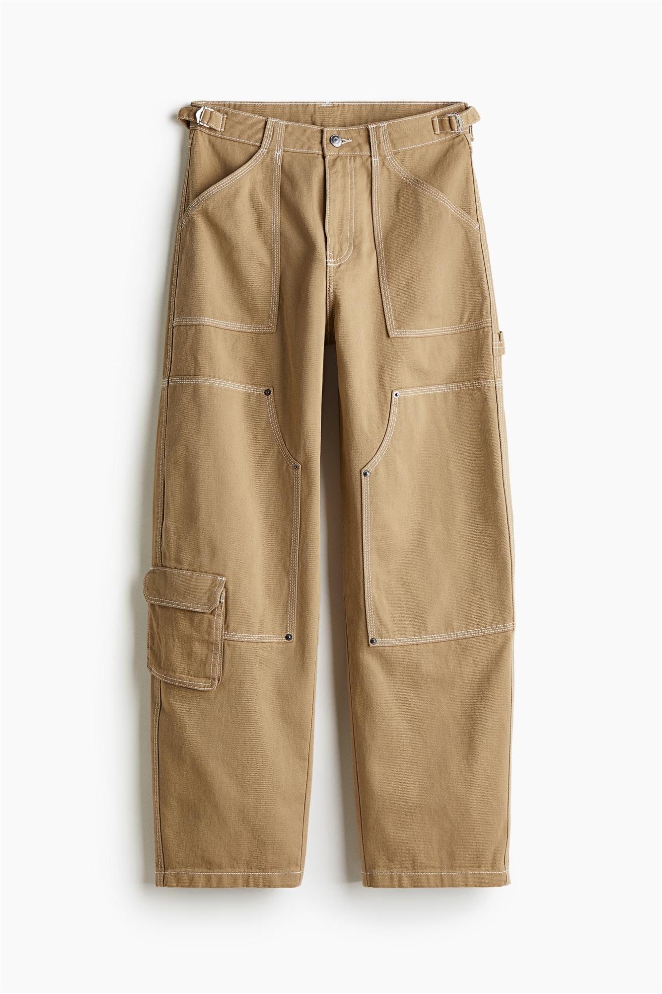 Брюки свободного кроя из хлопковой саржи с ширинкой на молнии и пуговице и обычной талией с регулируемым язычком и металлической застежкой с каждой стороны. Накладные передние карманы и открытые задние карманы. Широкие штанины с нашивками и петлей для молотка на одной штанине и карманом с клапаном на другой.