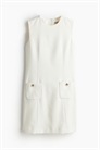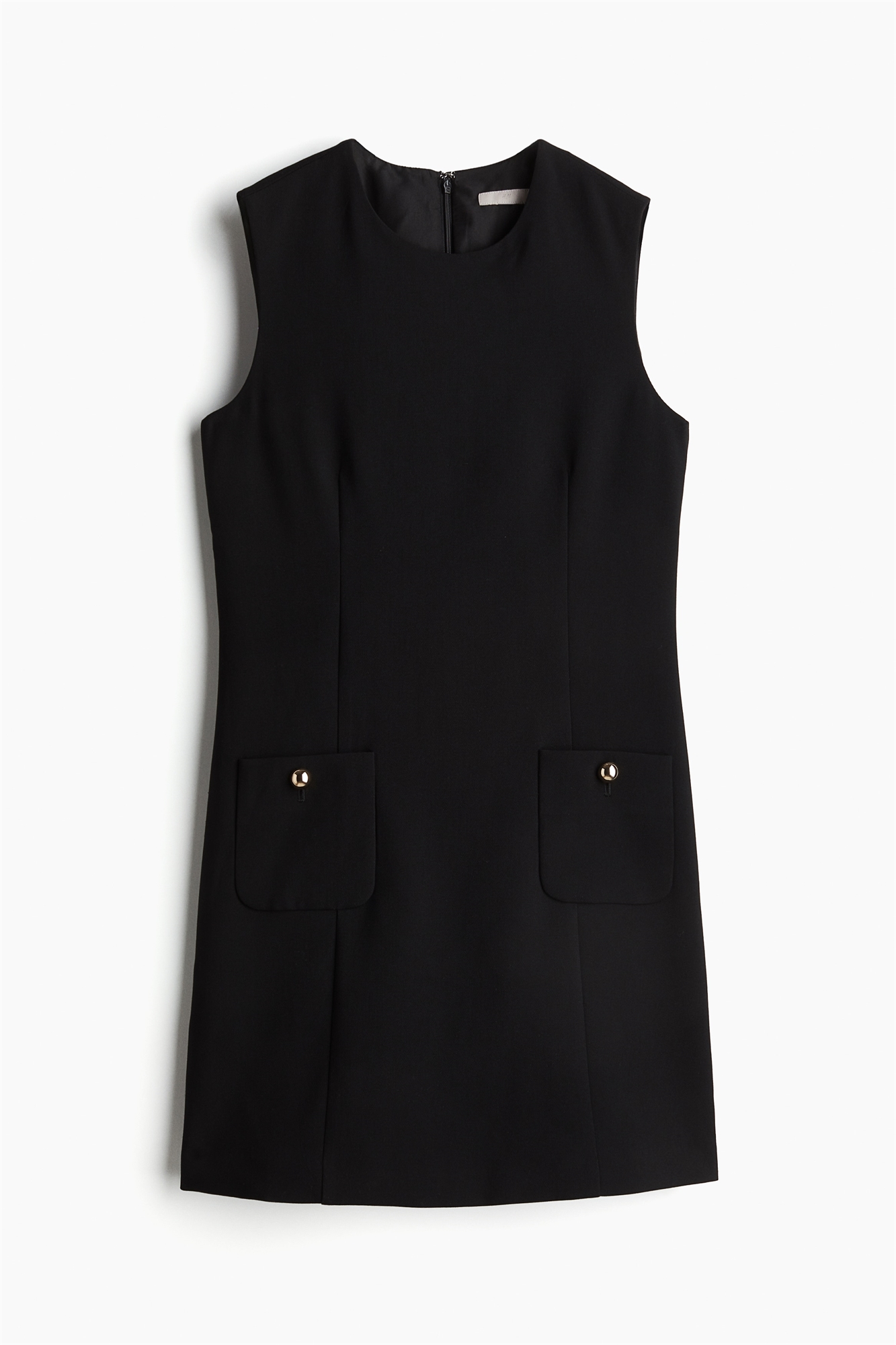 Короткое платье без рукавов из тканого материала с круглым вырезом и потайной застежкой на молнию и крючок-глазок сзади на шее. Вытачки на талии спереди и сзади и накладные передние карманы с металлической пуговицей золотистого цвета. На подкладке.
