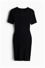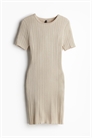 Короткое приталенное платье из неравномерного трикотажа в рубчик с круглым вырезом в рубчик, короткими рукавами и прямым подолом.
