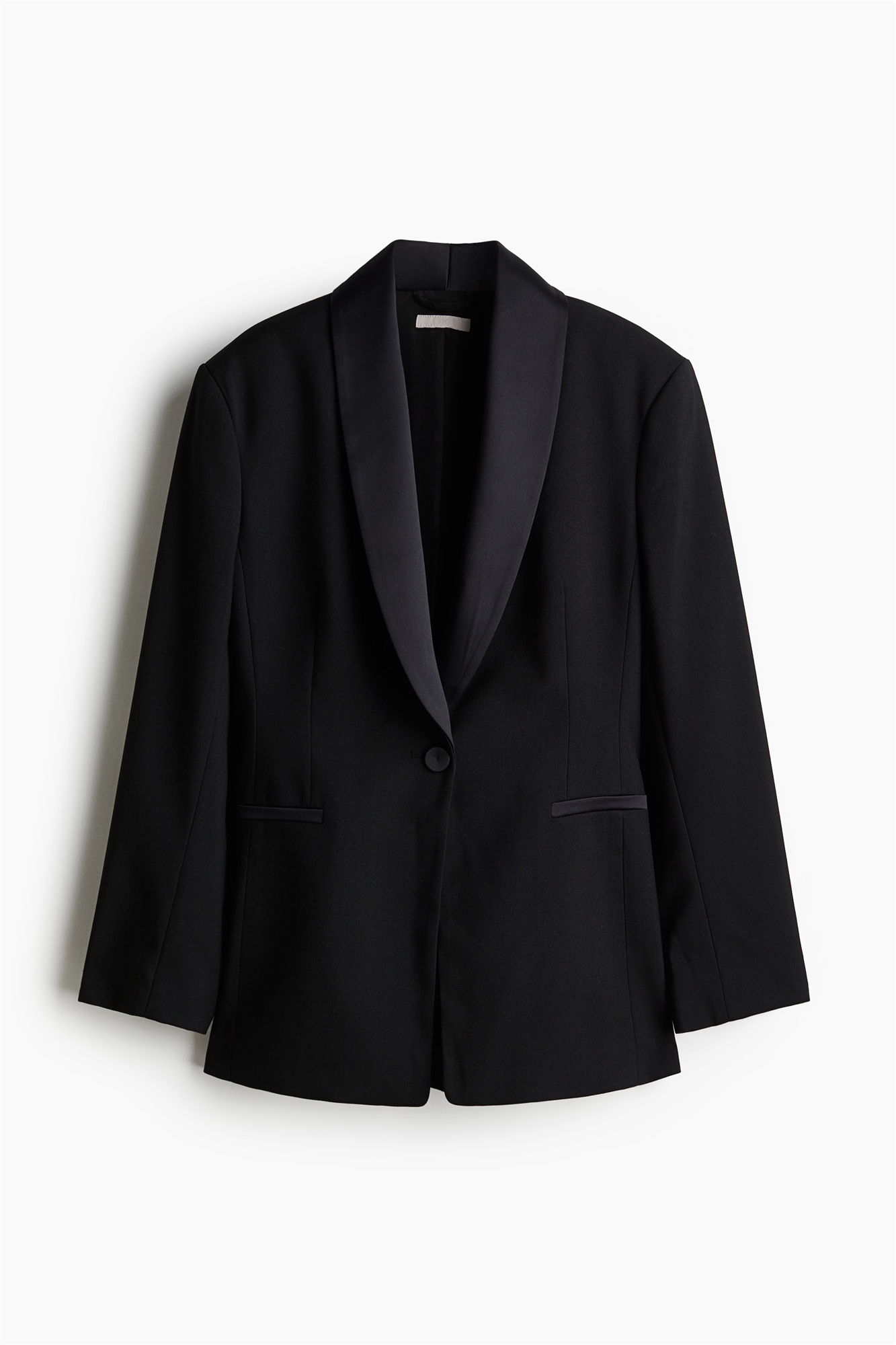 Однобортный смокинг-блейзер из тканого материала с атласными шалевыми лацканами и одной закрытой пуговицей спереди. Накладки на плечах, втачные передние карманы и одна задняя отворотка. На подкладке.