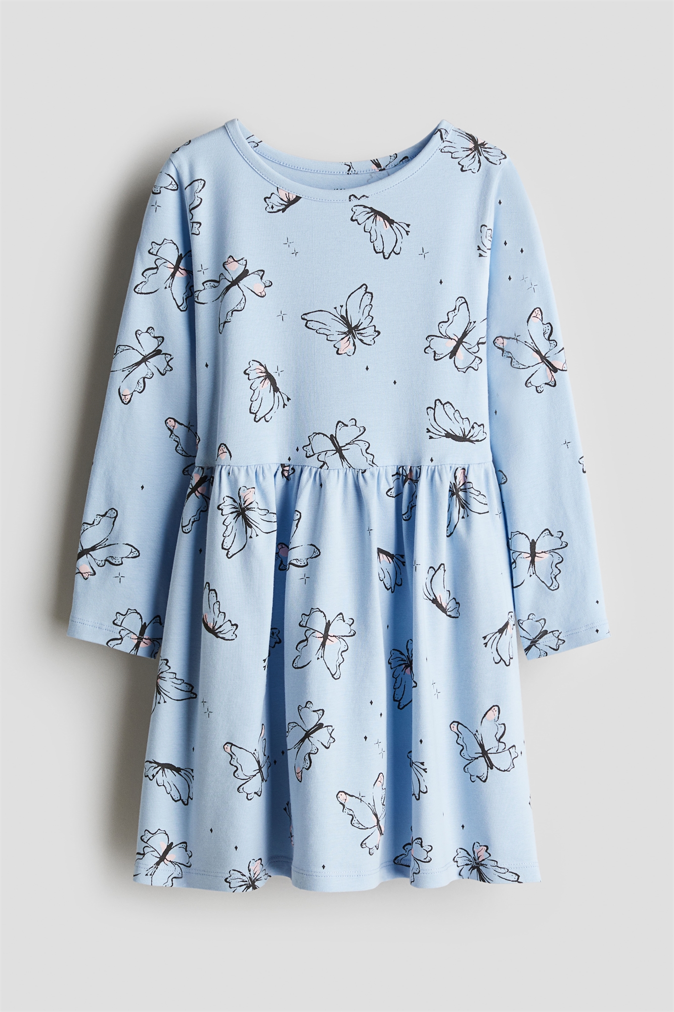 Платье с длинными рукавами из принтованного хлопкового джерси, со сборкой на талии и расклешенной юбкой.