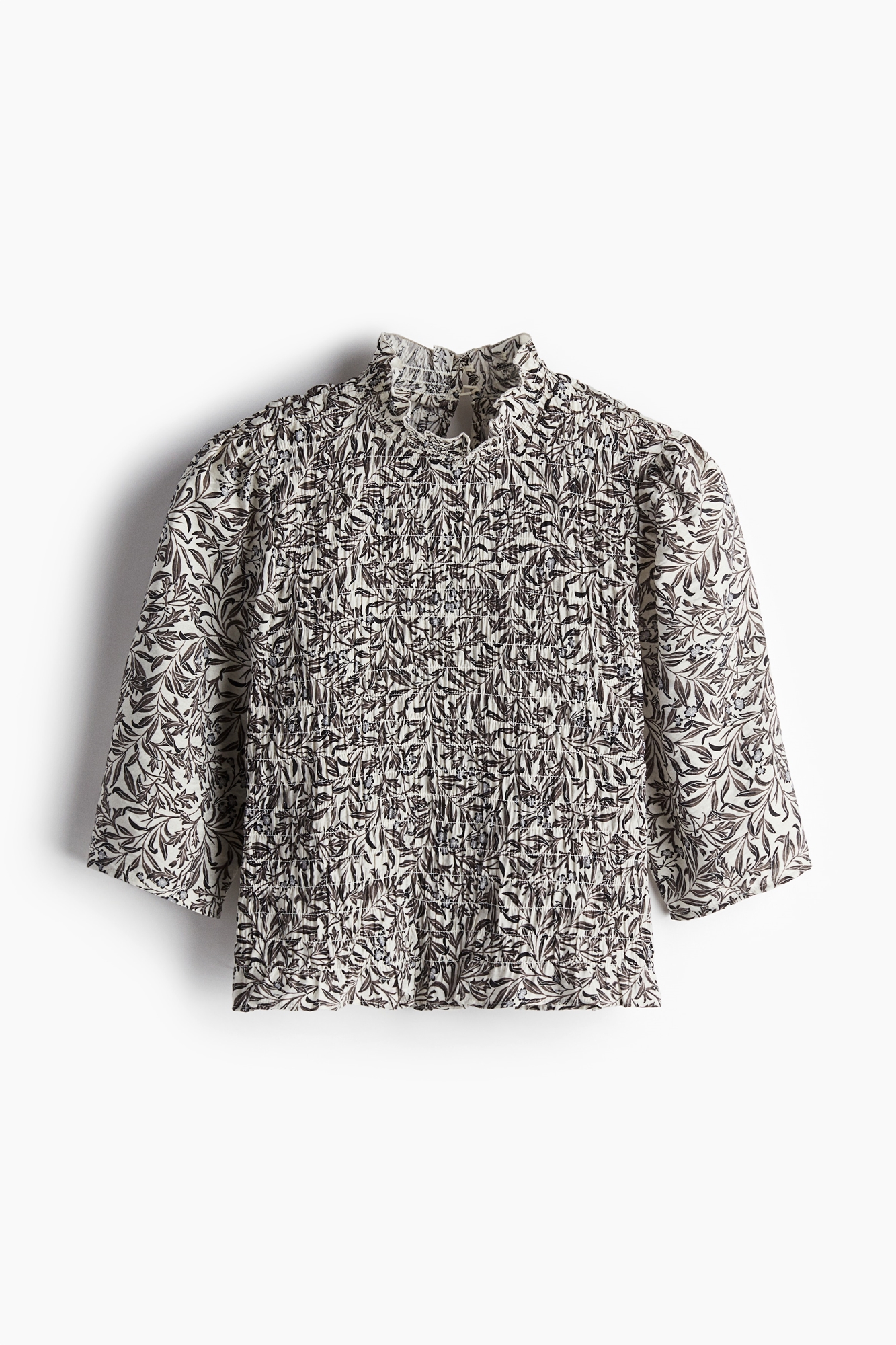 Короткая приталенная блузка из тканого материала с вывязанным лифом. Воротник-стойка с окантовкой, отверстие для ключа с пуговицами сзади на шее и пышные рукава длиной до локтя. Подол с окантовкой.