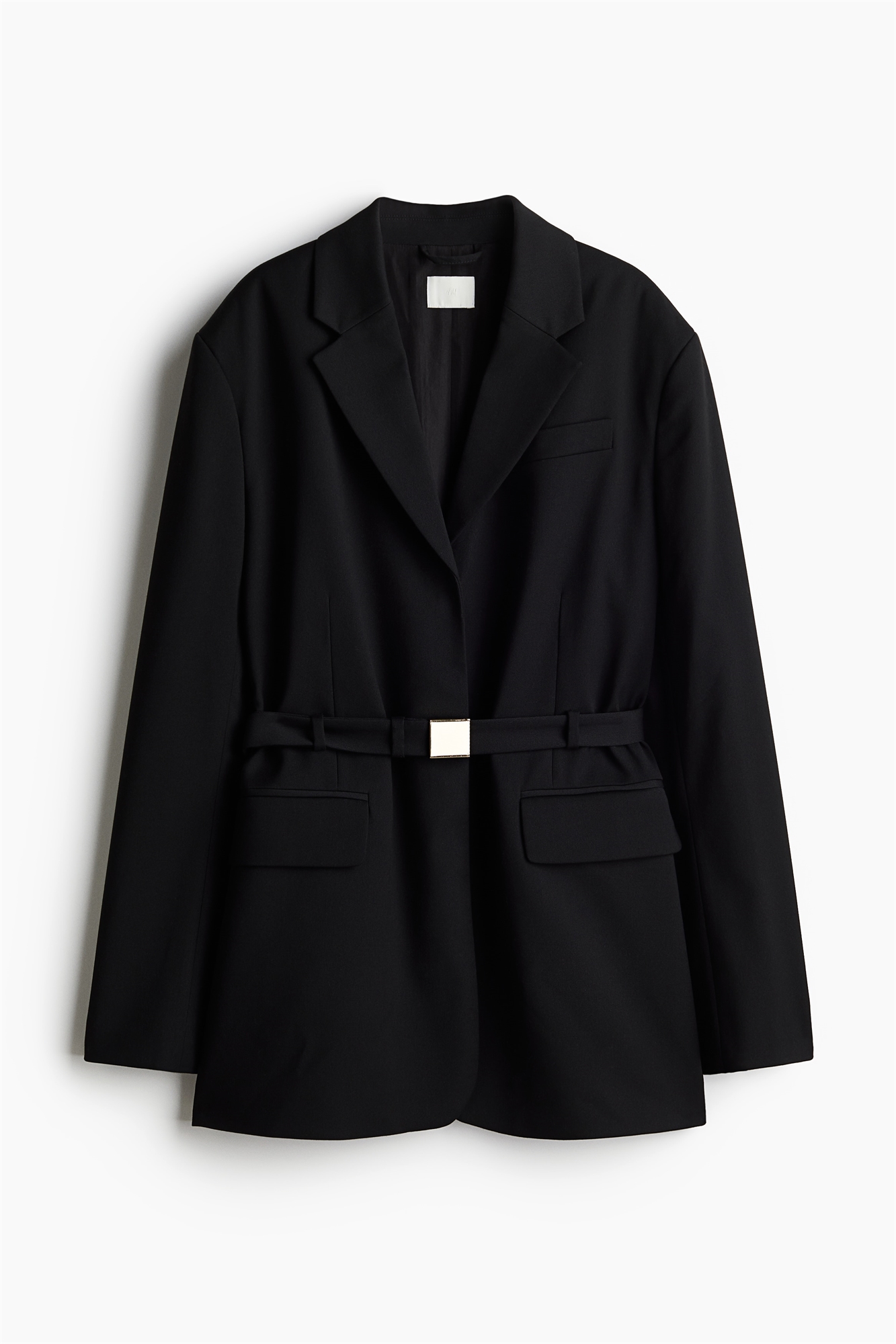 Однобортный блейзер из тканого материала с лацканами с вырезом, потайными кнопками спереди и съемным поясом на талии с металлической пряжкой. Накладки на плечах, длинные рукава, накладной карман на груди и втачные передние карманы с клапаном. На подкладке.