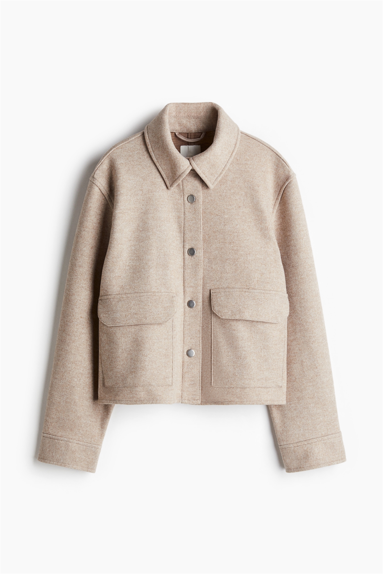 Свободный жакет из войлока с воротником и металлическими пуговицами спереди. Рукава с манжетами на пуговицах и накладные передние карманы с клапаном. Без подкладки.