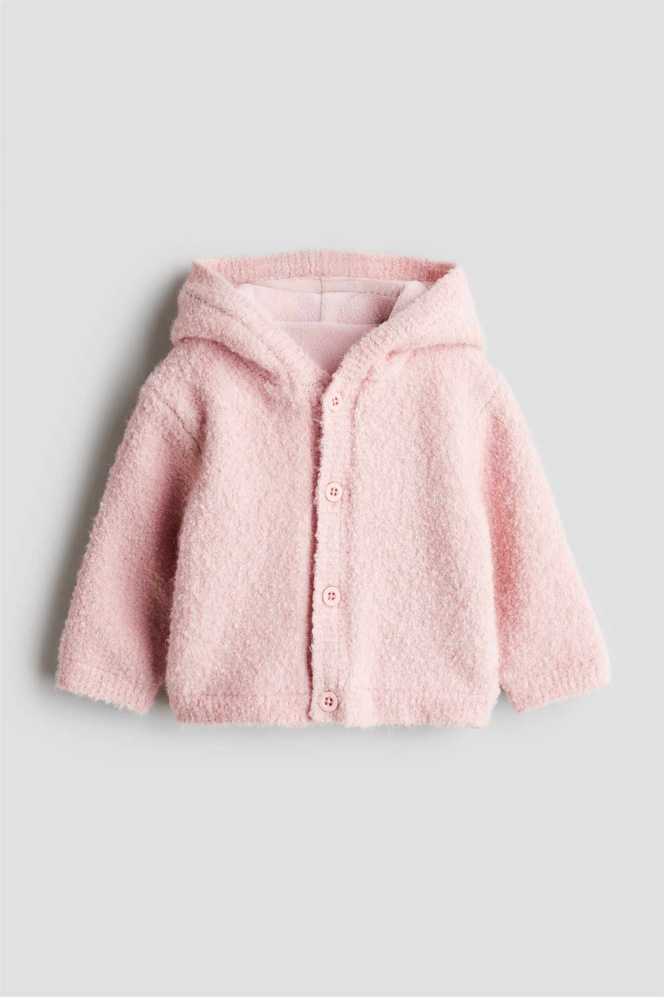 Кардиган из мягкого трикотажа с капюшоном с аппликацией в виде ушей, пуговицами спереди и длинными рукавами. Окантовка вокруг капюшона, по краю пуговиц, на манжетах и подоле. Подкладка из джерси.