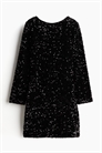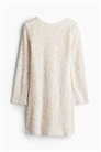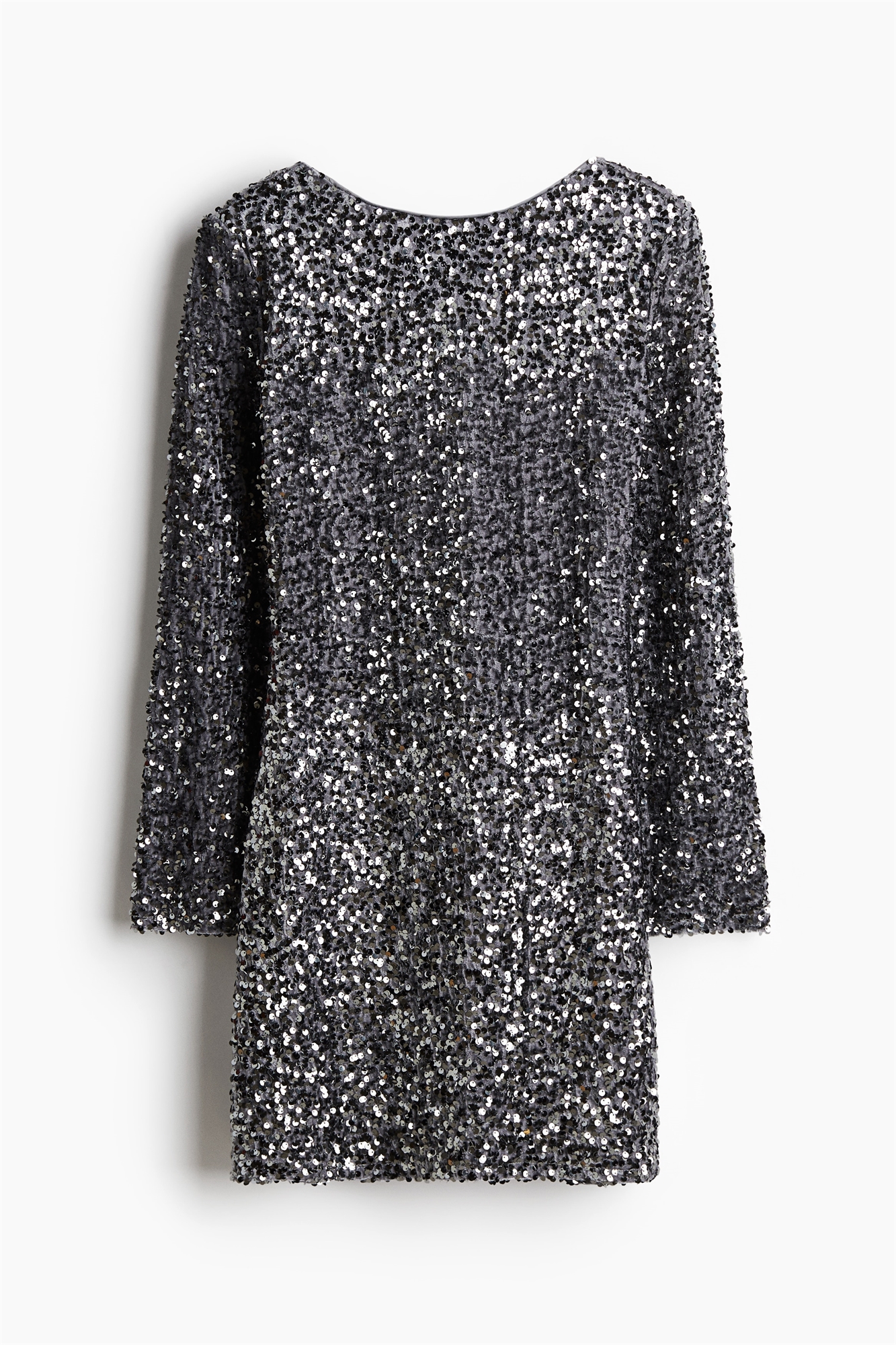 Короткое приталенное платье из блестящего трикотажа с горловиной-лодочкой спереди и глубоким круглым вырезом сзади. Слегка спущенные плечи и длинные рукава.