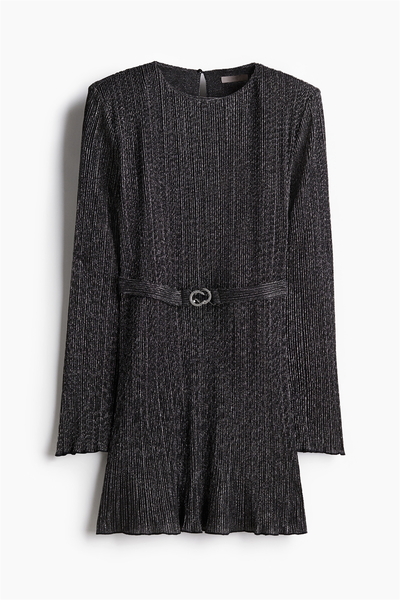 Короткое платье из трикотажа плиссе с блестящими нитями. Круглый вырез и отверстие под ключ с потайной пуговицей сзади. Накладки на плечах, длинные рукава и эластичный пояс на талии с металлической пряжкой, украшенной стразами. На подкладке.