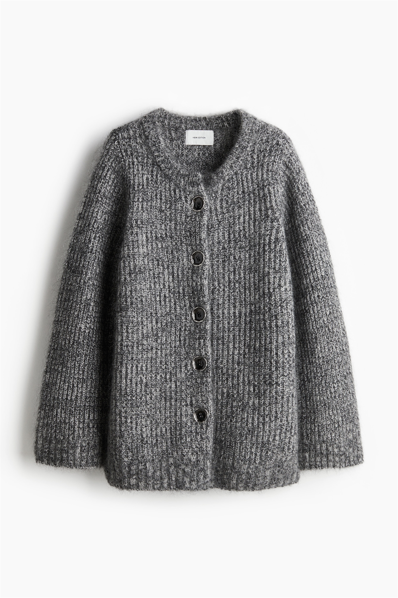 Длинный кардиган свободного кроя из мягкого трикотажа в рубчик с добавлением мохера и шерсти. Круглый вырез, асимметричные металлические пуговицы спереди и длинные широкие рукава. Окантовка вокруг выреза, на манжетах и подоле.